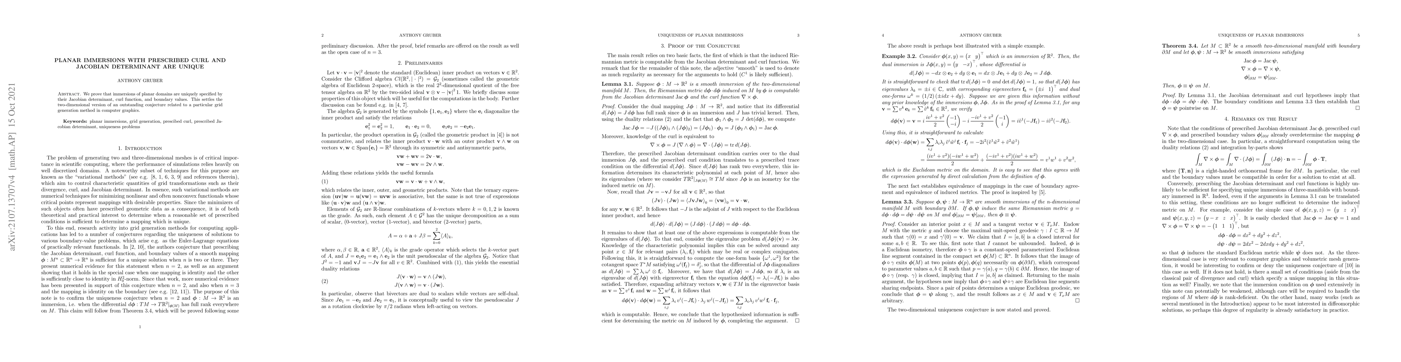 This paper proves the uniqueness of planar domain immersions determined by their Jacobian determinant, curl function, and boundary values, resolving a long-standing conjecture in computer graphics grid generation.