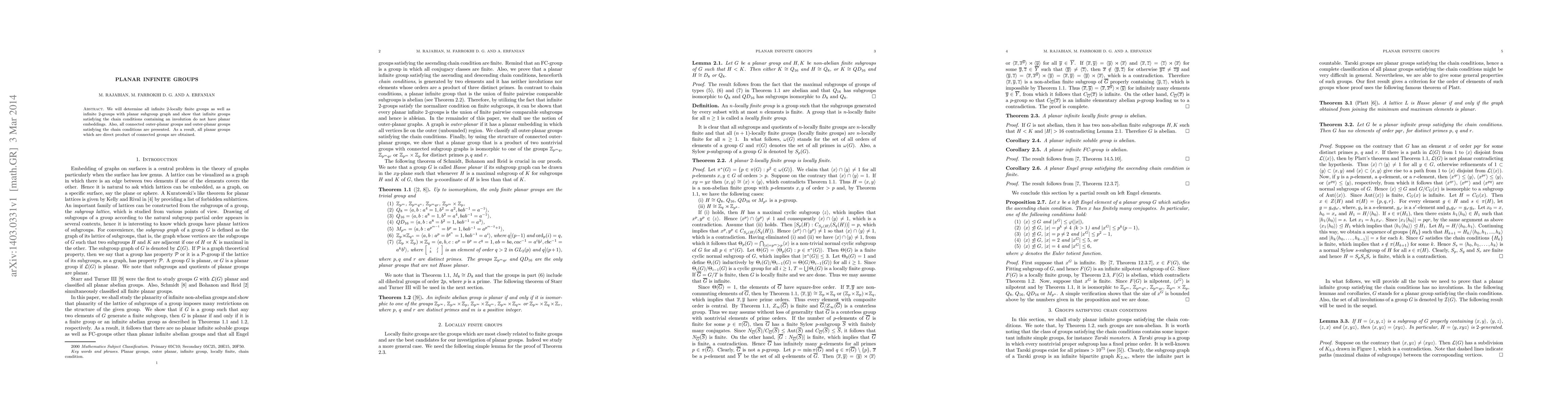 We will determine all infinite $2$-locally finite groups as well as infinite $2$-groups with planar subgroup graph and show that infinite groups satisfying the chain conditions containing an involution do not have planar embeddings. Also, all connected outer-planar groups and outer-planar groups satisfying the chain conditions are presented. As a result, all planar groups which are direct product of connected groups are obtained.