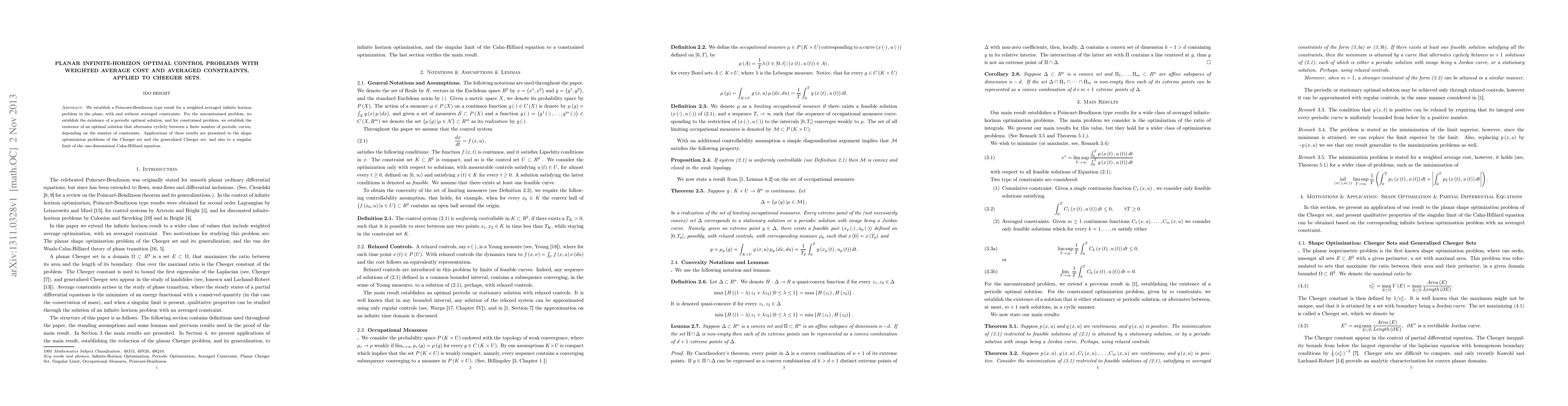 We establish a Poincar\`E-Bendixson type result for a weighted averaged infinite horizon problem in the plane, with and without averaged constraints. For the unconstrained problem, we establish the existence of a periodic optimal solution, and for constrained problem, we establish the existence of an optimal solution that alternates cyclicly between a finite number of periodic curves, depending on the number of constraints. Applications of these results are presented to the shape optimization problems of the Cheeger set and the generalized Cheeger set, and also to a singular limit of the one-dimensional Cahn-Hilliard equation