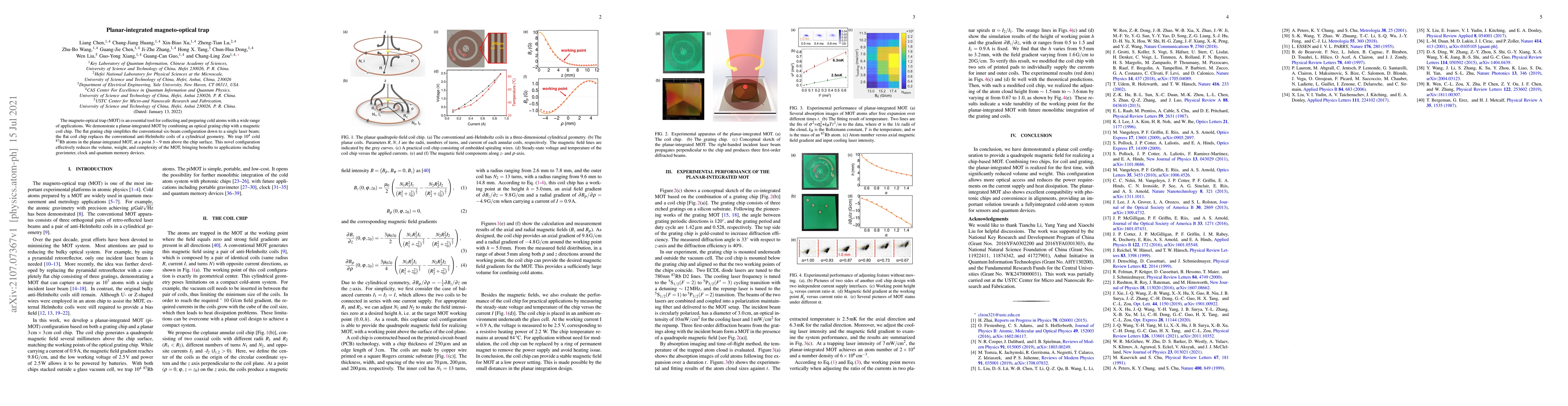 Abstract The magneto-optical trap (MOT) is an essential tool for collecting and preparing cold atoms with a wide range of applications. We demonstrate a planar-integrated MOT by combining an optical grating chip with a magnetic coil chip. The flat grating chip simplifies the conventional six-beam configuration down to a single laser beam; the flat coil chip replaces the conventional anti-Helmholtz coils of a cylindrical geometry. We trap 10^{4} cold ^{87}\text{Rb} atoms in the planar-integrated MOT, at a point 3-9 mm above the chip surface. This novel configuration effectively reduces the volume, weight, and complexity of the MOT, bringing benefits to applications including gravimeter, clock and quantum memory devices.