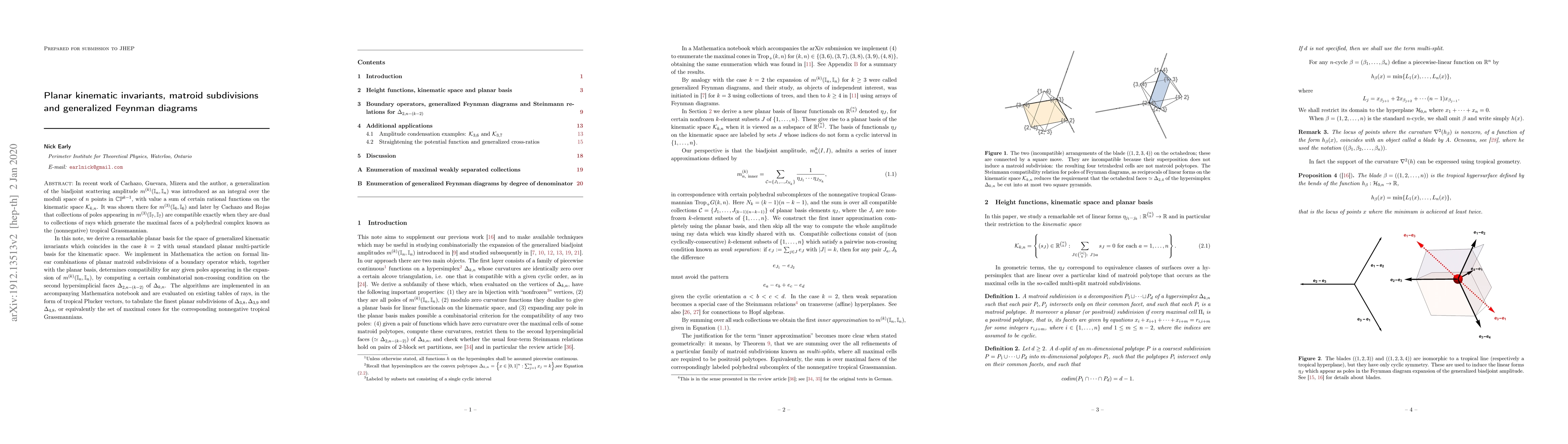 In recent work of Cachazo, Guevara, Mizera and the author, a generalization of the biadjoint scattering amplitude $m^{(k)}(\mathbb{I}_n,\mathbb{I}_n)$ was introduced as an integral over the moduli space of $n$ points in $\mathbb{CP}^{k-1}$, with value a sum of certain rational functions on the kinematic space $\mathcal{K}_{k,n}$. It was shown there for $m^{(3)}(\mathbb{I}_6,\mathbb{I}_6)$ and later by Cachazo and Rojas that collections of poles appearing in $m^{(3)}(\mathbb{I}_7,\mathbb{I}_7)$ are compatible exactly when they are dual to collections of rays which generate the maximal faces of a polyhedral complex known as the (nonnegative) tropical Grassmannian. In this note, we derive a remarkable planar basis for the space of generalized kinematic invariants which coincides in the case $k=2$ with usual standard planar multi-particle basis for the kinematic space. We implement in Mathematica the action on formal linear combinations of planar matroid subdivisions of a boundary operator which, together with the planar basis, determines compatibility for any given poles appearing in the expansion of $m^{(k)}(\mathbb{I}_n,\mathbb{I}_n)$, by computing a certain combinatorial non-crossing condition on the second hypersimplicial faces $\Delta_{2,n-(k-2)}$ of $\Delta_{k,n}$. The algorithms are implemented in an accompanying Mathematica notebook and are evaluated on existing tables of rays, in the form of tropical Plucker vectors, to tabulate the finest planar subdivisions of $\Delta_{3,8},\Delta_{3,9}$ and $ \Delta_{4,8}$, or equivalently the set of maximal cones for the corresponding nonnegative tropical Grassmannians.