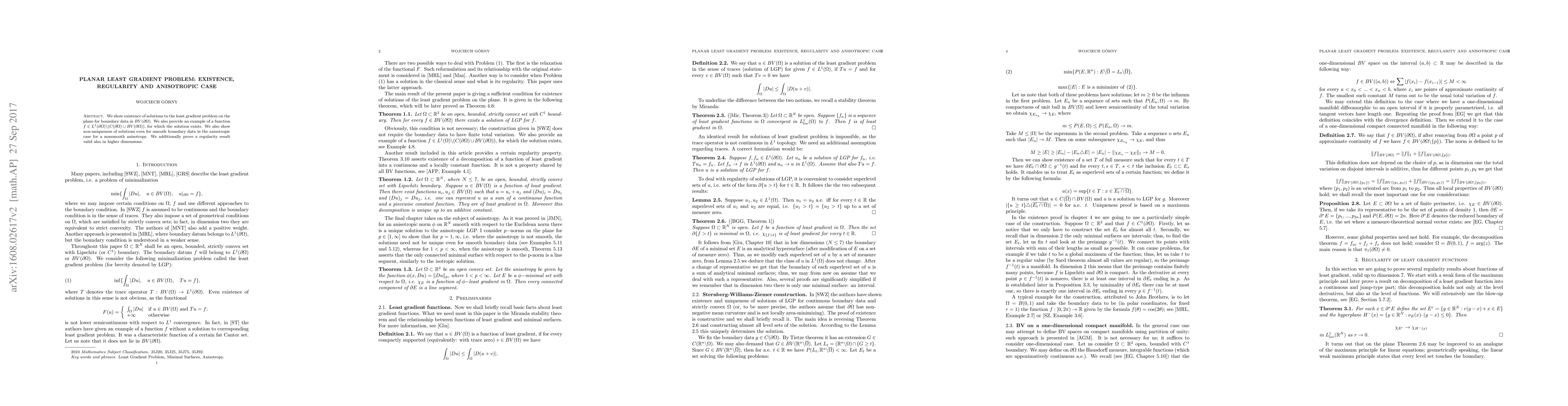 This paper proves existence of solutions to the least gradient problem on a plane for certain boundary conditions, while also showing non-uniqueness and regularity results in higher dimensions.