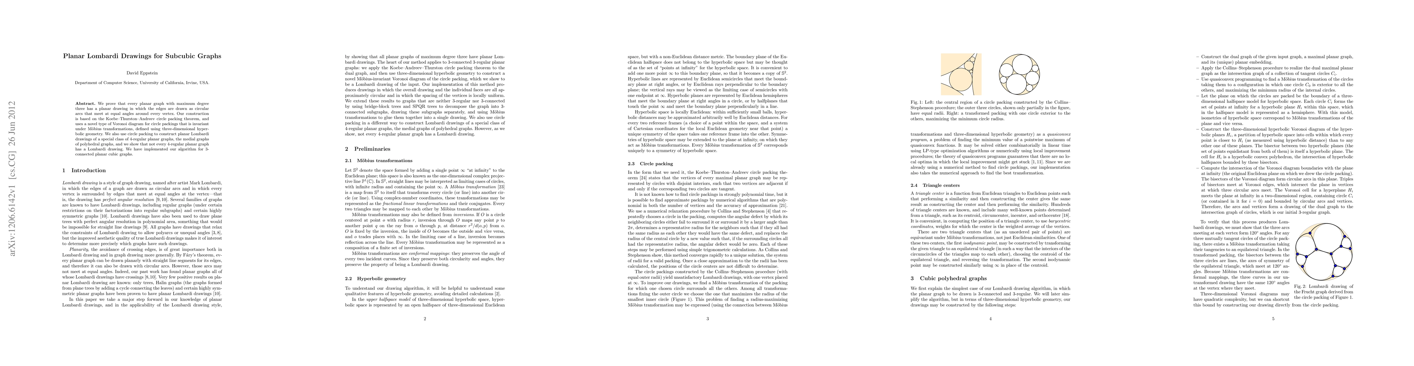 We prove that every planar graph with maximum degree three has a planar drawing in which the edges are drawn as circular arcs that meet at equal angles around every vertex. Our construction is based on the Koebe-Thurston-Andreev circle packing theorem, and uses a novel type of Voronoi diagram for circle packings that is invariant under Moebius transformations, defined using three-dimensional hyperbolic geometry. We also use circle packing to construct planar Lombardi drawings of a special class of 4-regular planar graphs, the medial graphs of polyhedral graphs, and we show that not every 4-regular planar graph has a Lombardi drawing. We have implemented our algorithm for 3-connected planar cubic graphs.