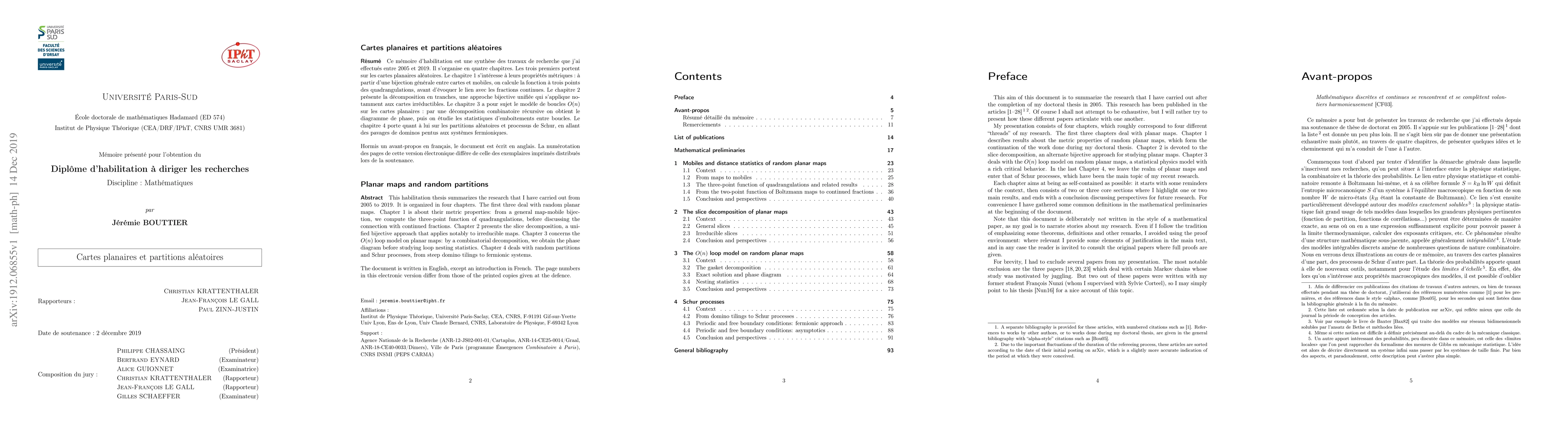 This habilitation thesis explores random planar maps, focusing on their metric properties, slice decomposition, and the $O(n)$ loop model, while also delving into random partitions and Schur processes. The research spans from 2005 to 2019, covering metric computations, combinatorial decompositions, and statistical analysis of loop models.
