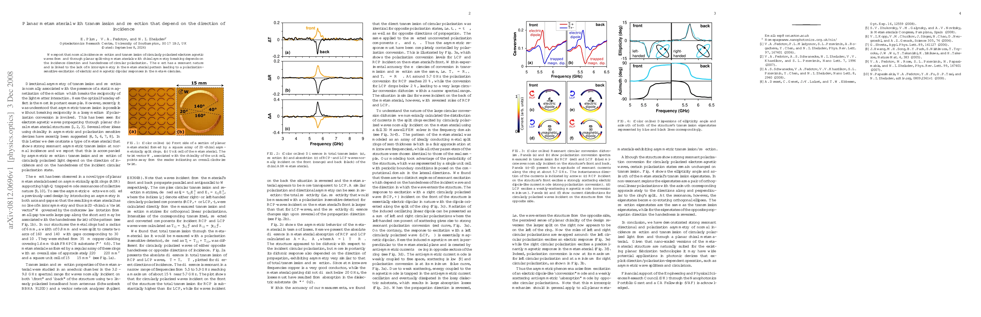This paper investigates planar split-ring metamaterials that exhibit direction-dependent reflection and transmission of circularly polarized electromagnetic waves due to chiral symmetry breaking and lack of mirror symmetry, resulting in polarization-sensitive excitation of electric and magnetic dipolar responses. The effect is resonant and varies with the incidence direction and polarization handedness.