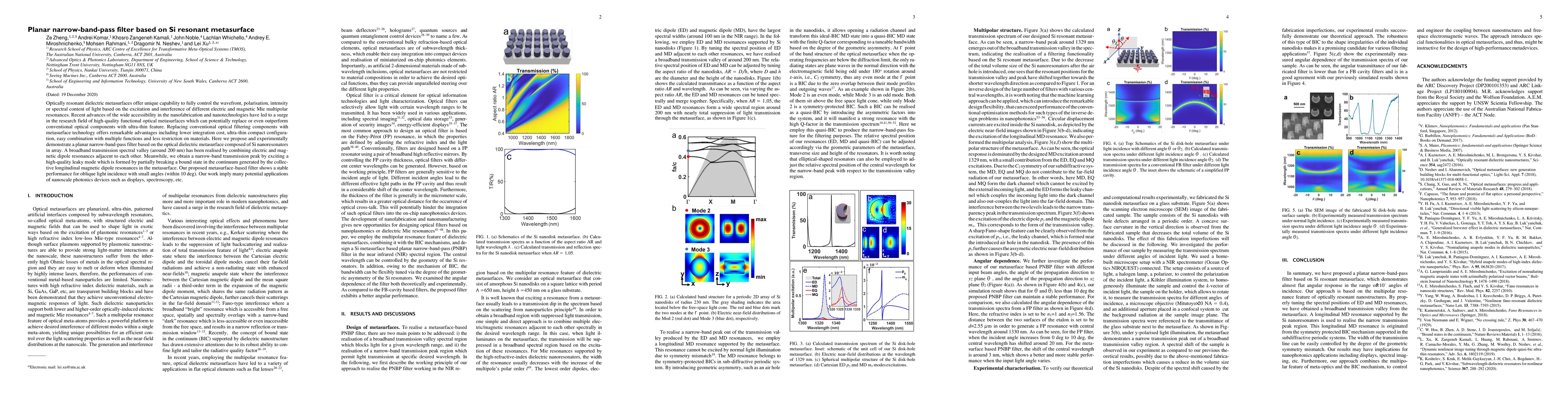 This paper proposes and demonstrates a planar narrow-band-pass filter using a Si resonant metasurface composed of nanoresonators, achieving a broadband transmission valley and a narrow-band transmission peak through controlled Mie resonances. The metasurface offers advantages like ultra-thin design and stable performance under oblique incidence.