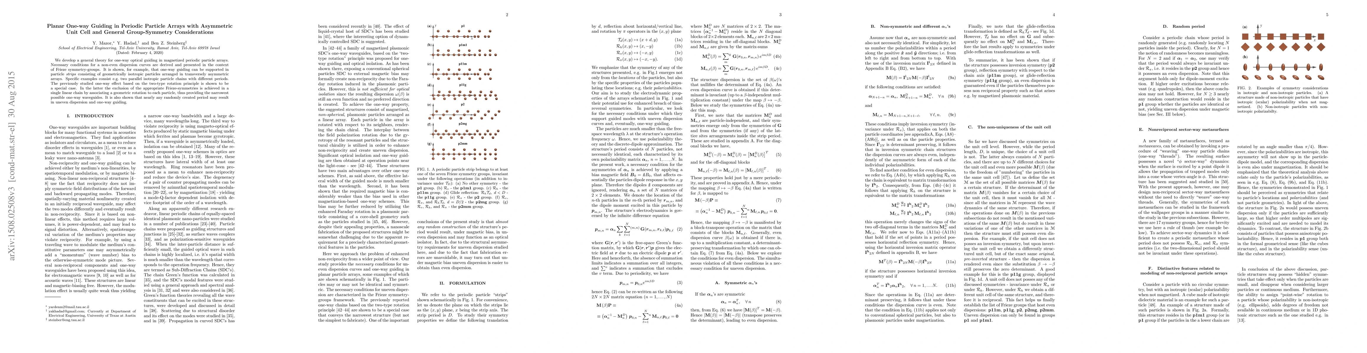 We develop a general theory for one-way optical guiding in magnetized periodic particle arrays. Necessary conditions for a non-even dispersion curves are derived and presented in the context of Frieze symmetry-groups. It is shown, for example, that one-way guiding can be supported in particle \emph{strips} consisting of geometrically isotropic particles arranged in transversely asymmetric arrays. Specific examples consist e.g.~two parallel isotropic particle chains with different periods. The previously studied one-way effect based on the two-type rotation principle is shown to be a special case. In the latter the exclusion of the appropriate Frieze-symmetries is achieved in a single linear chain by associating a geometric rotation to each particle, thus providing the narrowest possible one-way waveguides. It is also shown that nearly any randomly created period may result in uneven dispersion and one-way guiding.