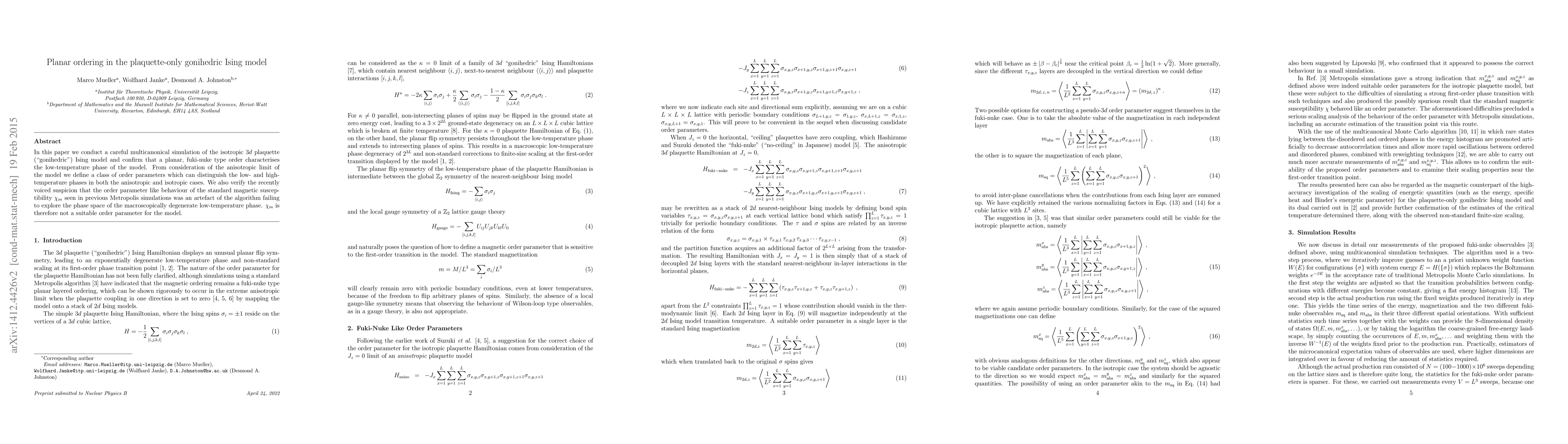 In this paper we conduct a careful multicanonical simulation of the isotropic $3d$ plaquette ("gonihedric") Ising model and confirm that a planar, fuki-nuke type order characterises the low-temperature phase of the model. From consideration of the anisotropic limit of the model we define a class of order parameters which can distinguish the low- and high-temperature phases in both the anisotropic and isotropic cases. We also verify the recently voiced suspicion that the order parameter like behaviour of the standard magnetic susceptibility $\chi_m$ seen in previous Metropolis simulations was an artefact of the algorithm failing to explore the phase space of the macroscopically degenerate low-temperature phase. $\chi_m$ is therefore not a suitable order parameter for the model.
