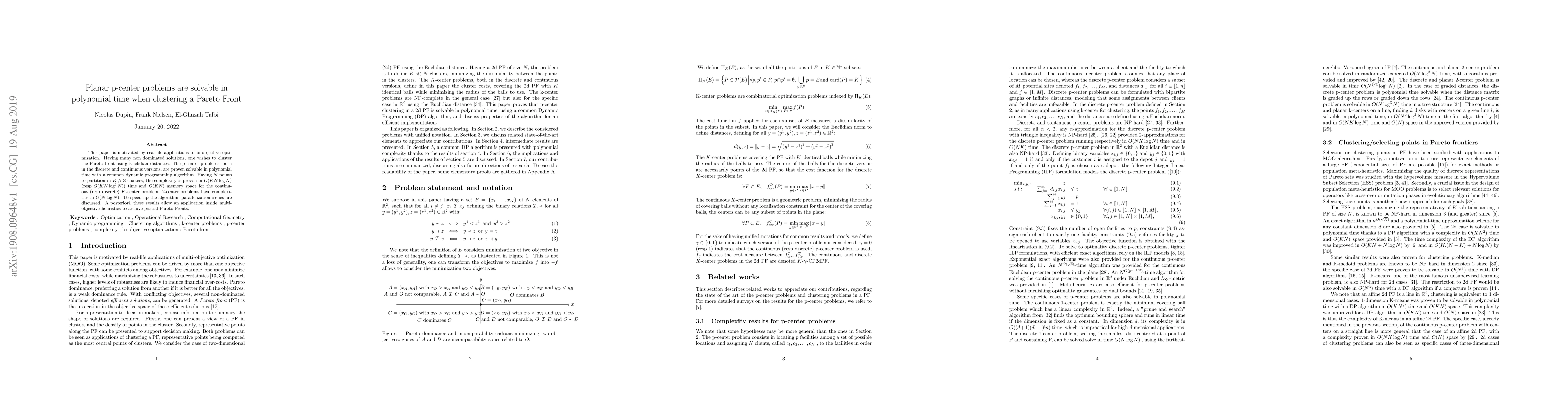 This paper is motivated by real-life applications of bi-objective optimization. Having many non dominated solutions, one wishes to cluster the Pareto front using Euclidian distances. The p-center problems, both in the discrete and continuous versions, are proven solvable in polynomial time with a common dynamic programming algorithm. Having $N$ points to partition in $K\geqslant 3$ clusters, the complexity is proven in $O(KN\log N)$ (resp $O(KN\log^2 N)$) time and $O(KN)$ memory space for the continuous (resp discrete) $K$-center problem. $2$-center problems have complexities in $O(N\log N)$. To speed-up the algorithm, parallelization issues are discussed. A posteriori, these results allow an application inside multi-objective heuristics to archive partial Pareto Fronts.