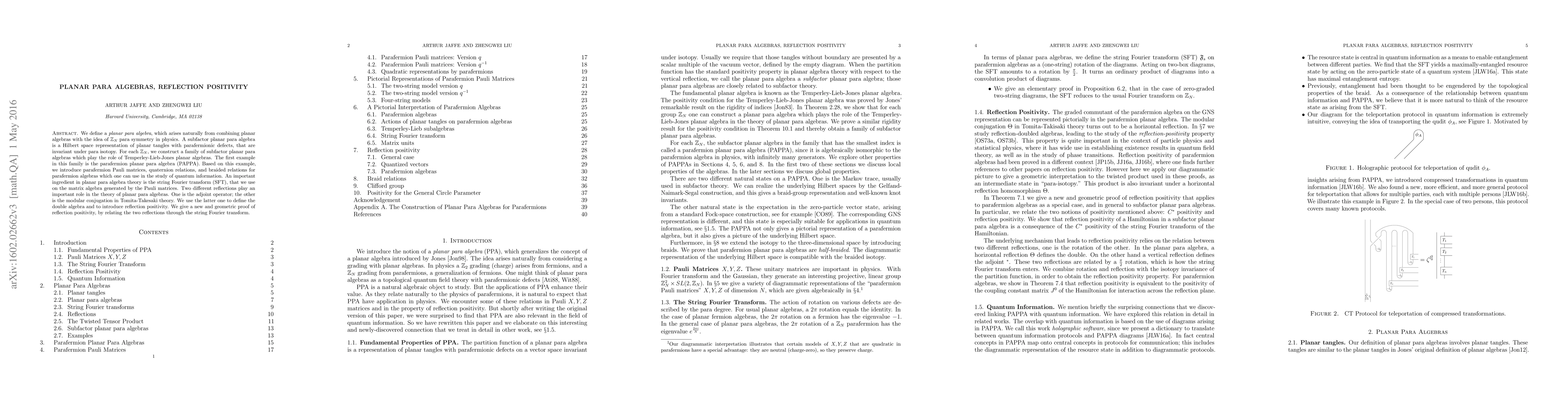 We define a planar para algebra, which arises naturally from combining planar algebras with the idea of $\mathbb{Z}_{N}$ para symmetry in physics. A subfactor planar para algebra is a Hilbert space representation of planar tangles with parafermionic defects, that are invariant under para isotopy. For each $\mathbb{Z}_{N}$, we construct a family of subfactor planar para algebras which play the role of Temperley-Lieb-Jones planar algebras. The first example in this family is the parafermion planar para algebra (PAPPA). Based on this example, we introduce parafermion Pauli matrices, quaternion relations, and braided relations for parafermion algebras which one can use in the study of quantum information. An important ingredient in planar para algebra theory is the string Fourier transform (SFT), that we use on the matrix algebra generated by the Pauli matrices. Two different reflections play an important role in the theory of planar para algebras. One is the adjoint operator; the other is the modular conjugation in Tomita-Takesaki theory. We use the latter one to define the double algebra and to introduce reflection positivity. We give a new and geometric proof of reflection positivity, by relating the two reflections through the string Fourier transform.