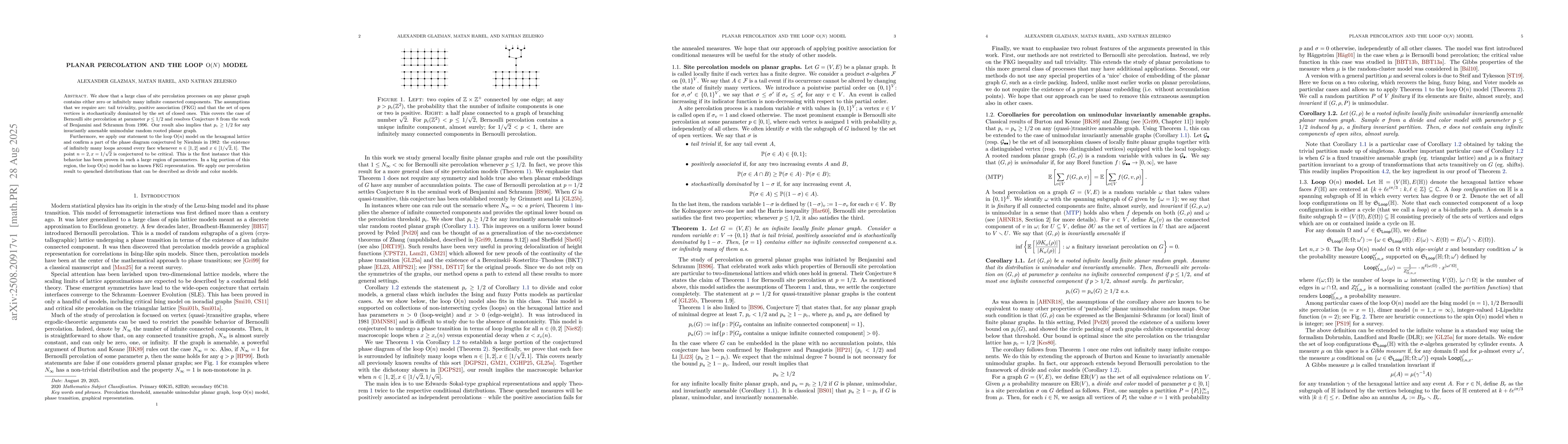 We show that a large class of site percolation processes on any planar graph contains either zero or infinitely many infinite connected components. The assumptions that we require are: tail triviality, positive association (FKG) and that the set of open vertices is stochastically dominated by the set of closed ones. This covers the case of Bernoulli site percolation at parameter $p\leq 1/2$ and resolves Conjecture 8 from the work of Benjamini and Schramm from 1996. Our result also implies that $p_c\geq 1/2$ for any invariantly amenable unimodular random rooted planar graph. Furthermore, we apply our statement to the loop O(n) model on the hexagonal lattice and confirm a part of the phase diagram conjectured by Nienhuis in 1982: the existence of infinitely many loops around every face whenever $n\in [1,2]$ and $x\in [1/\sqrt{2},1]$. The point $n=2,x=1/\sqrt{2}$ is conjectured to be critical. This is the first instance that this behavior has been proven in such a large region of parameters. In a big portion of this region, the loop O(n) model has no known FKG representation. We apply our percolation result to quenched distributions that can be described as divide and color models.