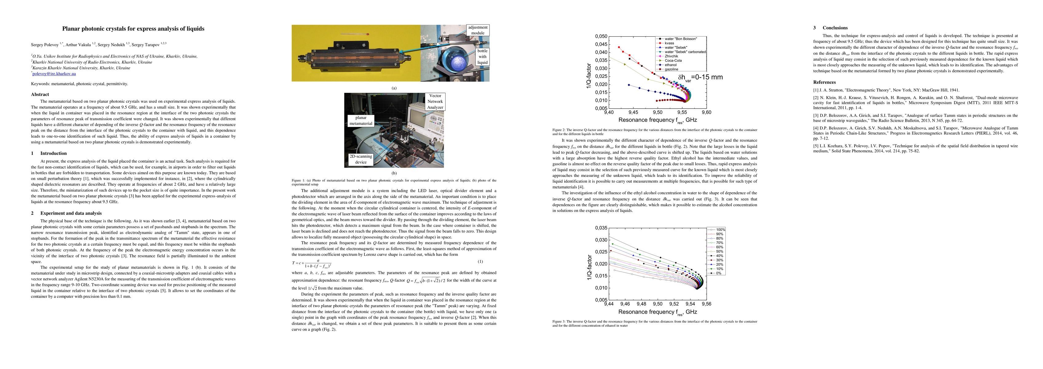 The metamaterial based on two planar photonic crystals was used on experimental express analysis of liquids. The metamaterial operates at a frequency of about 9.5 GHz, and has a small size. It was shown experimentally that when the liquid in container was placed in the resonance region at the interface of the two photonic crystals the parameters of resonance peak of transmission coefficient were changed. It was shown experimentally that different liquids have a different character of depending of the inverse Q-factor and the resonance frequency of the resonance peak on the distance from the interface of the photonic crystals to the container with liquid, and this dependence leads to one-to-one identification of such liquid. Thus, the ability of express analysis of liquids in a container by using a metamaterial based on two planar photonic crystals is demonstrated experimentally.