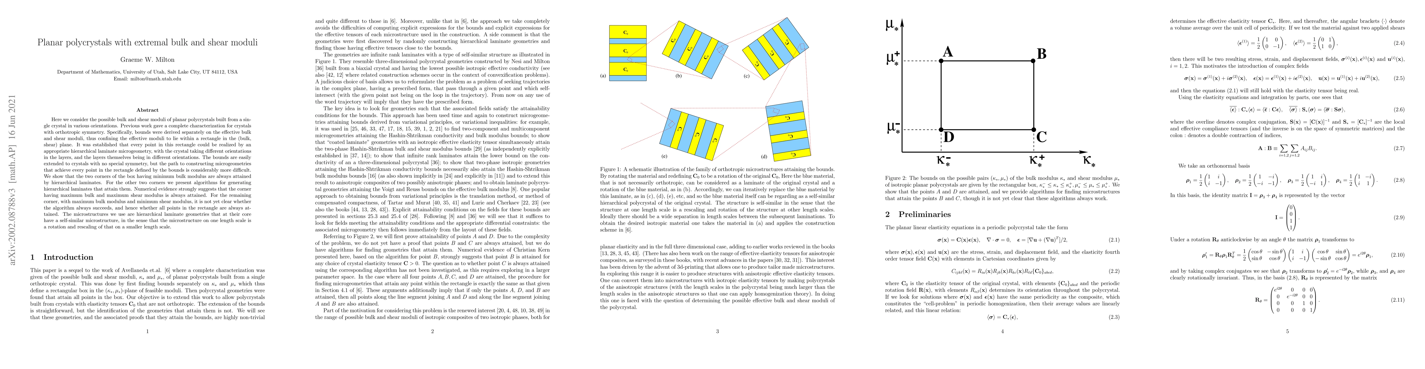 Here we consider the possible bulk and shear moduli of planar polycrystals built from a single crystal in various orientations. Previous work gave a complete characterization for crystals with orthotropic symmetry. Specifically, bounds were derived separately on the effective bulk and shear moduli, thus confining the effective moduli to lie within a rectangle in the (bulk, shear) plane. It was established that every point in this rectangle could be realized by an appropriate hierarchical laminate microgeometry, with the crystal taking different orientations in the layers, and the layers themselves being in different orientations. The bounds are easily extended to crystals with no special symmetry, but the path to constructing microgeometries that achieve every point in the rectangle defined by the bounds is considerably more difficult. We show that the two corners of the box having minimum bulk modulus are always attained by hierarchical laminates. For the other two corners we present algorithms for generating hierarchical laminates that attain them. Numerical evidence strongly suggests that the corner having maximum bulk and maximum shear modulus is always attained. For the remaining corner, with maximum bulk modulus and minimum shear modulus, it is not yet clear whether the algorithm always succeeds, and hence whether all points in the rectangle are always attained. The microstructures we use are hierarchical laminate geometries that at their core have a self-similar microstructure, in the sense that the microstructure on one length scale is a rotation and rescaling of that on a smaller length scale.