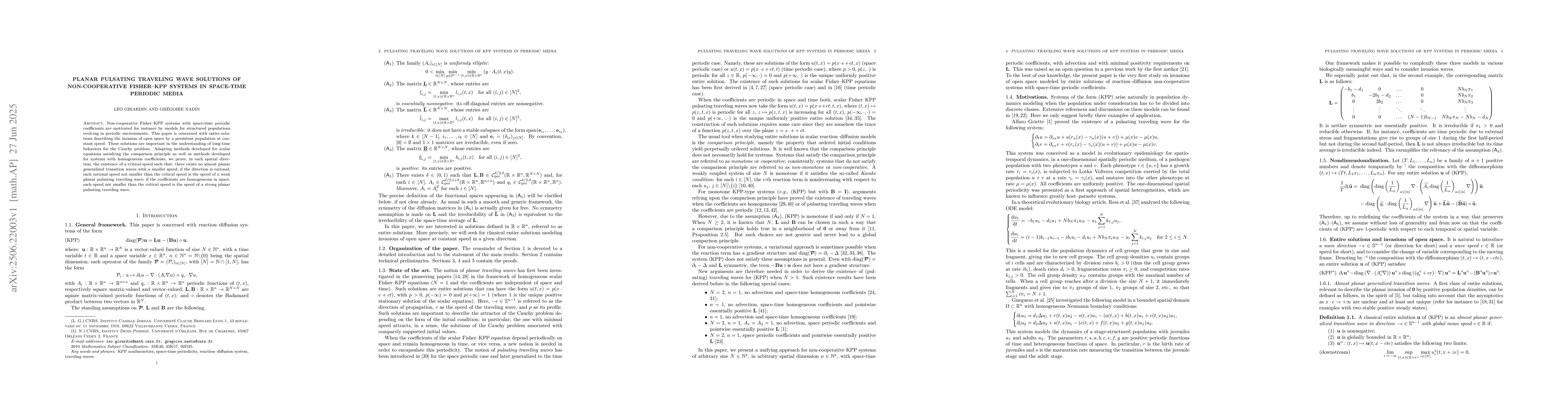 Non-cooperative Fisher-KPP systems with space-time periodic coefficients are motivated for instance by models for structured populations evolving in periodic environments. This paper is concerned with entire solutions describing the invasion of open space by a persistent population at constant speed. These solutions are important in the understanding of long-time behaviors for the Cauchy problem. Adapting methods developed for scalar equations satisfying the comparison principle as well as methods developed for systems with homogeneous coefficients, we prove, in each spatial direction, the existence of a critical speed such that: there exists no almost planar generalized transition waves with a smaller speed; if the direction is rational, each rational speed not smaller than the critical speed is the speed of a weak planar pulsating traveling wave; if the coefficients are homogeneous in space, each speed not smaller than the critical speed is the speed of a strong planar pulsating traveling wave.