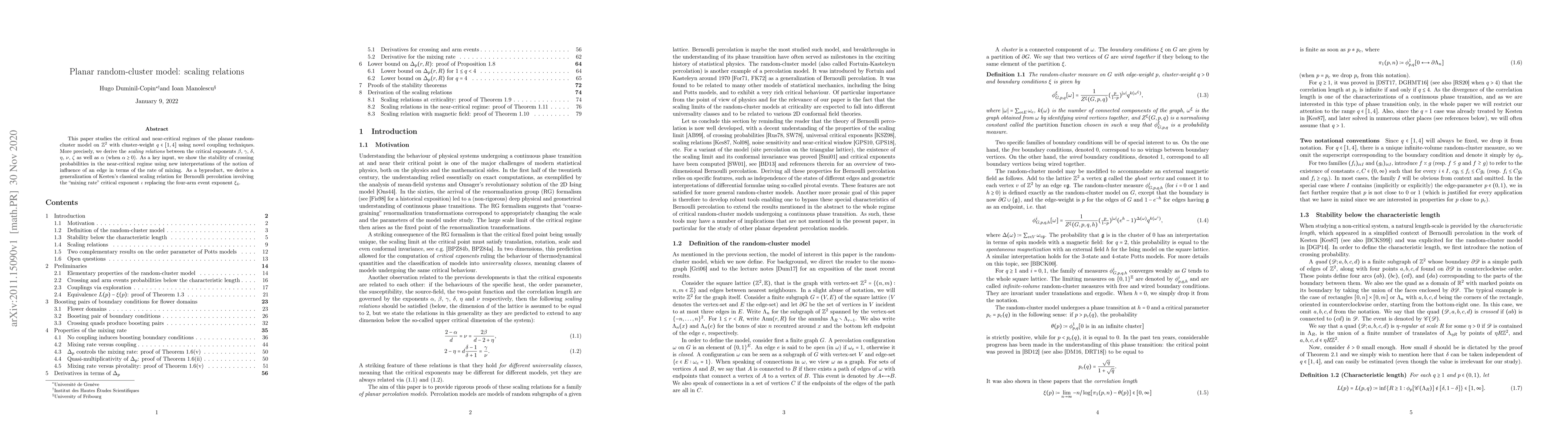 This paper investigates the critical behavior of the planar random-cluster model using novel coupling techniques, deriving scaling relations for critical exponents and demonstrating stability of crossing probabilities. It also generalizes Kesten's scaling relation by introducing a "mixing rate" critical exponent.