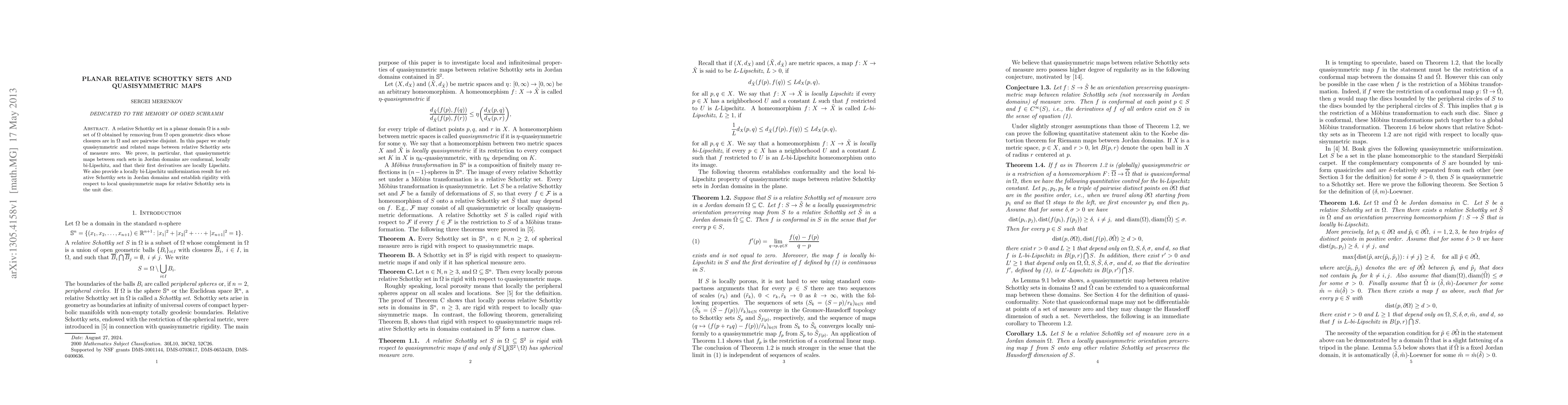 This paper investigates quasisymmetric maps between planar relative Schottky sets, proving they are conformal, locally bi-Lipschitz, and have locally Lipschitz first derivatives. It also establishes a uniformization result and shows rigidity concerning local quasisymmetric maps in the unit disc.