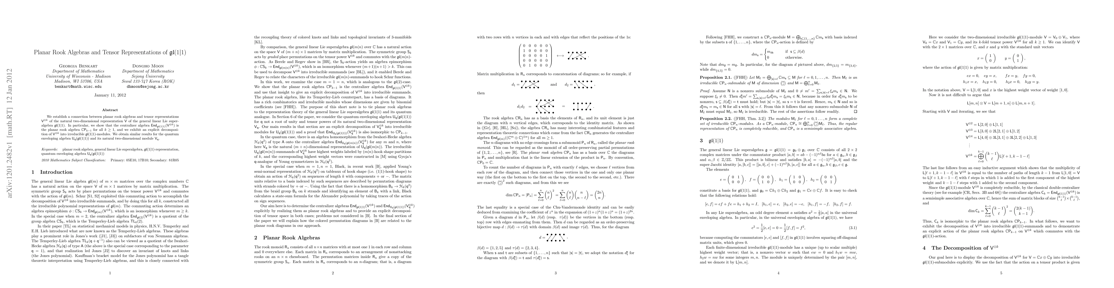 We establish a connection between planar rook algebras and tensor representations $\VV^{\otimes k}$ of the natural two-dimensional representation $\VV$ of the general linear Lie superalgebra $\gl$. In particular, we show that the centralizer algebra $\maths{End}_{\gl}(\VV^{\otimes k})$ is the planar rook algebra $\CC \mathsf{P}_{k-1}$ for all $k \geq 1$, and we exhibit an explicit decomposition of $\VV^{\otimes k}$ into irreducible $\gl$-modules. We obtain similar results for the quantum enveloping algebra $\UU_\qq(\gl)$ and its natural two-dimensional module $\VV_\qq$.