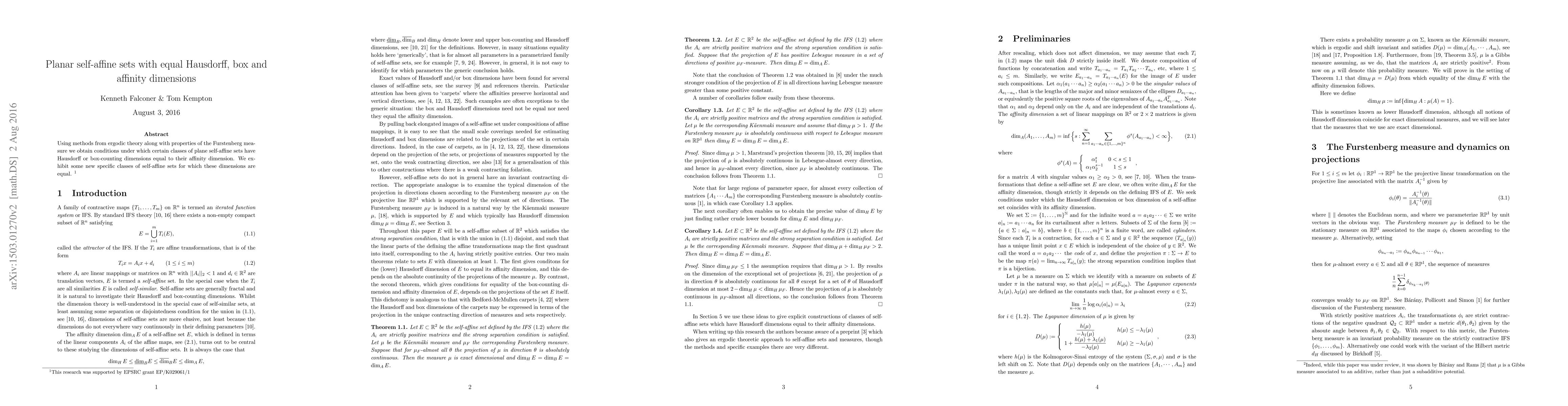 This paper explores conditions under which plane self-affine sets exhibit equal Hausdorff, box, and affinity dimensions using ergodic theory and Furstenberg measure. It identifies specific classes of self-affine sets where these dimensions coincide.
