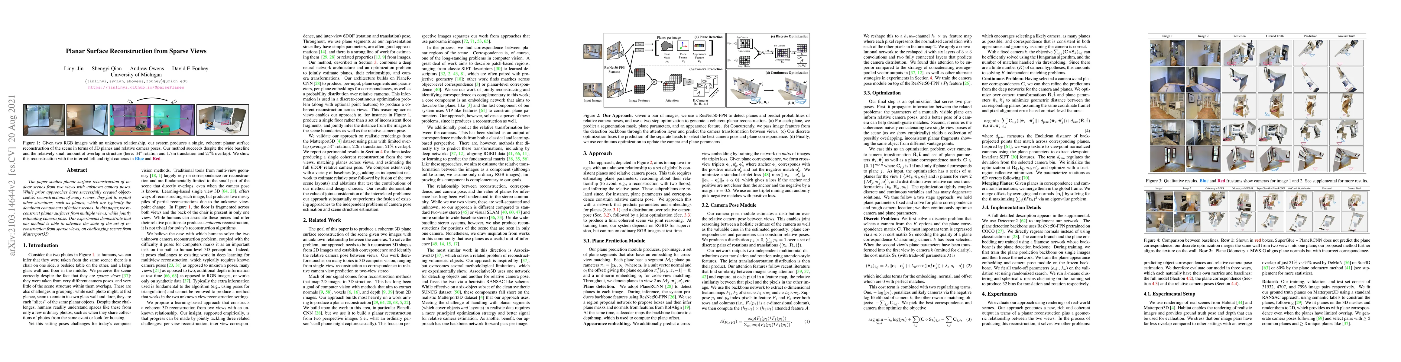 The paper studies planar surface reconstruction of indoor scenes from two views with unknown camera poses. While prior approaches have successfully created object-centric reconstructions of many scenes, they fail to exploit other structures, such as planes, which are typically the dominant components of indoor scenes. In this paper, we reconstruct planar surfaces from multiple views, while jointly estimating camera pose. Our experiments demonstrate that our method is able to advance the state of the art of reconstruction from sparse views, on challenging scenes from Matterport3D. Project site: https://jinlinyi.github.io/SparsePlanes/