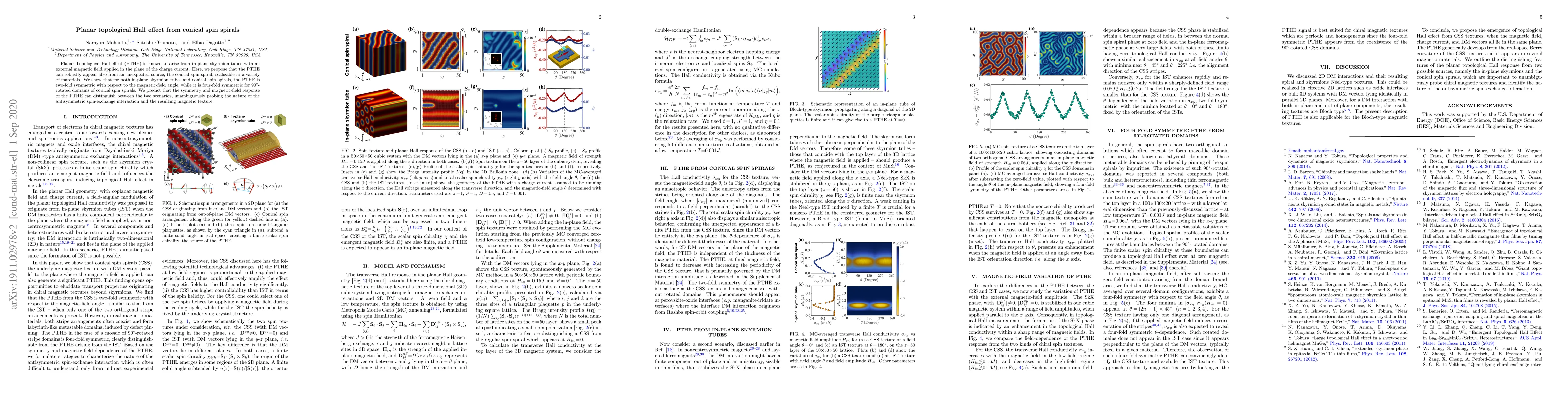 Planar Topological Hall effect (PTHE) is known to arise from in-plane skyrmion tubes with an external magnetic field applied in the plane of the charge current. Here, we propose that the PTHE can robustly appear also from an unexpected source, the conical spin spiral, realizable in a variety of materials. We show that for both in-plane skyrmion tubes and conical spin spirals, the PTHE is two-fold symmetric with respect to the magnetic-field angle, while it is four-fold symmetric for 90$^{\circ}$-rotated domains of conical spin spirals. We predict that the symmetry and magnetic-field response of the PTHE can distinguish between the two scenarios, unambiguously probing the nature of the antisymmetric spin-exchange interaction and the resulting magnetic texture.