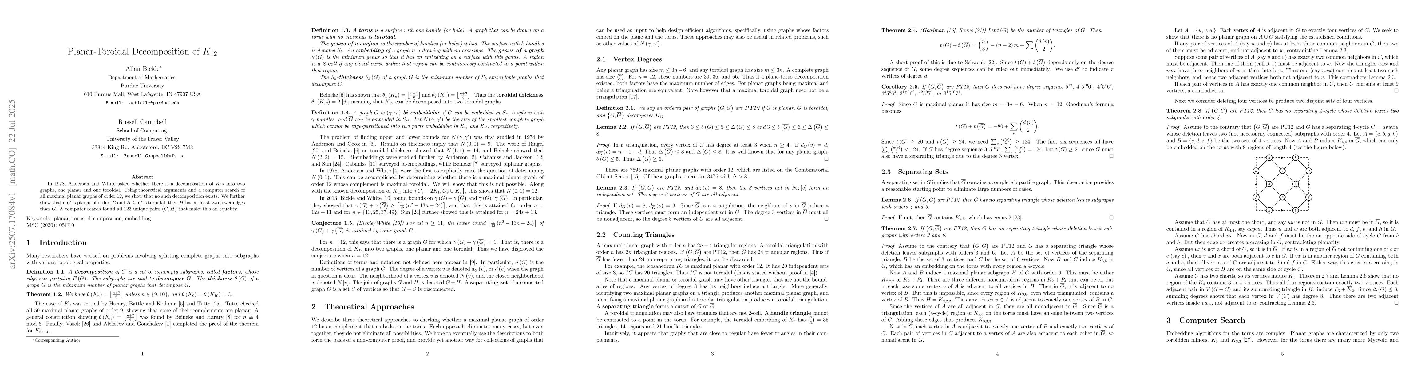 In 1978, Anderson and White asked whether there is a decomposition of $K_{12}$ into two graphs, one planar and one toroidal. Using theoretical arguments and a computer search of all maximal planar graphs of order 12, we show that no such decomposition exists. We further show that if $G$ is planar of order 12 and $H\subseteq\overline{G}$ is toroidal, then $H$ has at least two fewer edges than $\overline{G}$. A computer search found all 123 unique pairs $\left(G,H\right)$ that make this an equality.