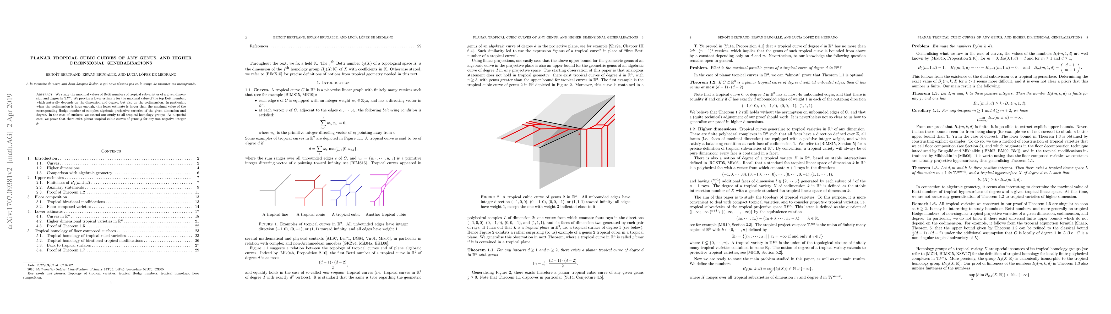 This paper investigates the Betti numbers of tropical subvarieties in $\mathbb{TP}^n$, offering a lower estimate for the top Betti number that surpasses the Hodge numbers of complex algebraic projective varieties when codimension is sufficiently large. It proves the existence of planar tropical cubic curves of any genus $g$.