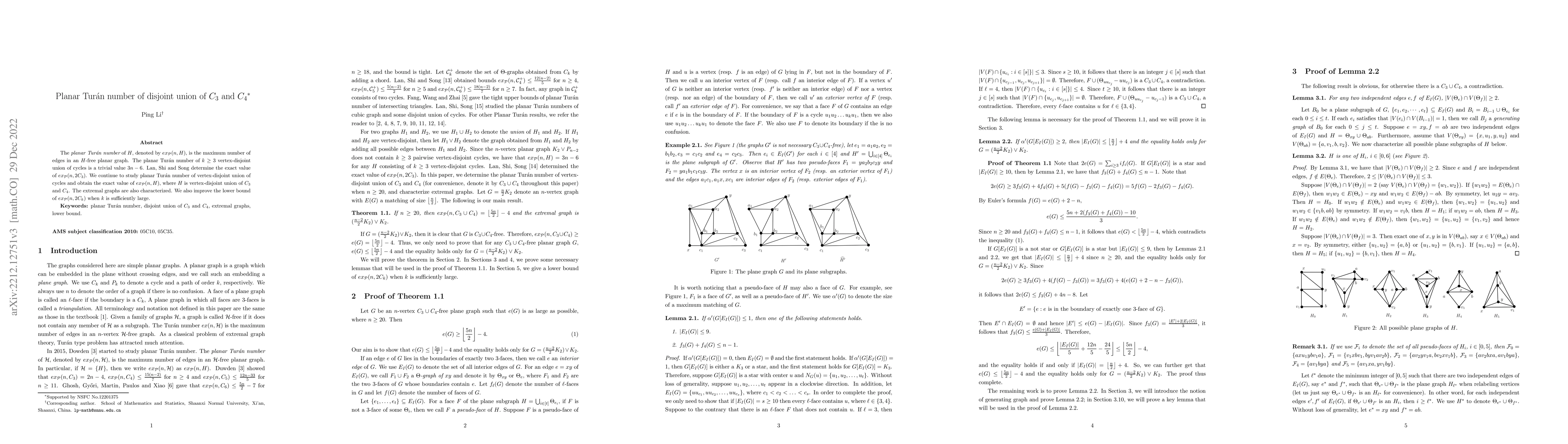 This paper determines the exact value of the planar Turán number for the disjoint union of $C_3$ and $C_4$, denoted by $ex_{\mathcal{P}}(n,H)$, and characterizes the extremal graphs. Additionally, it improves the lower bound for $ex_{\mathcal{P}}(n,2C_k)$ when $k$ is large.