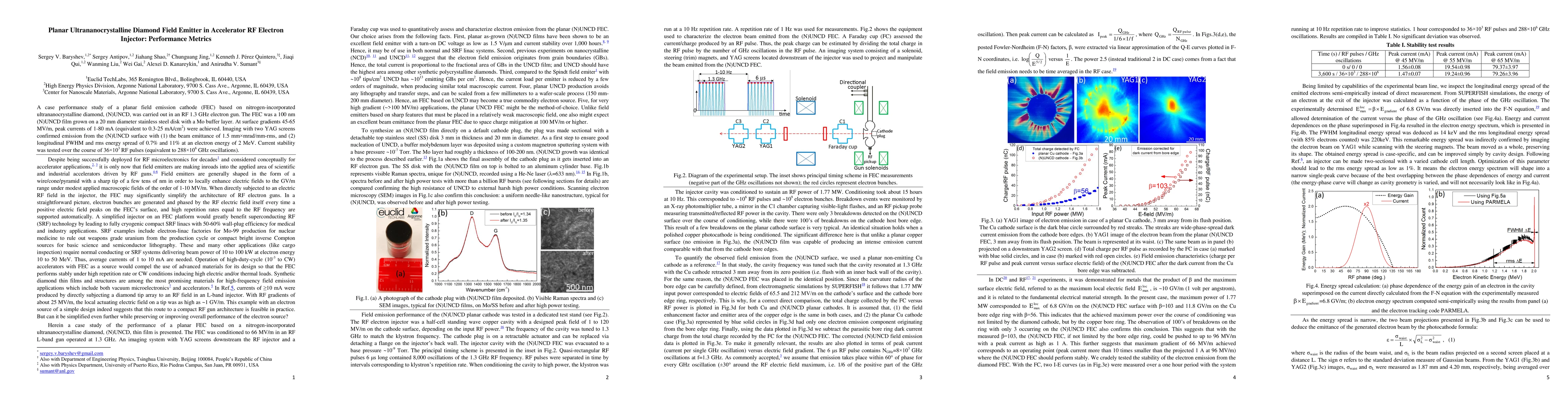 A case performance study of a planar field emission cathode (FEC) based on nitrogen-incorporated ultrananocrystalline diamond, (N)UNCD, was carried out in an RF 1.3 GHz electron gun. The FEC was a 100 nm (N)UNCD film grown on a 20 mm diameter stainless steel disk with a Mo buffer layer. At surface gradients 45-65 MV/m, peak currents of 1-80 mA (equivalent to 0.3-25 mA/cm$^2$) were achieved. Imaging with two YAG screens confirmed emission from the (N)UNCD surface with (1) the beam emittance of 1.5 mm$\times$mrad/mm-rms, and (2) longitudinal FWHM and rms energy spread of 0.7% and 11% at an electron energy of 2 MeV. Current stability was tested over the course of 36$\times$10$^3$ RF pulses (equivalent to 288$\times$10$^6$ GHz oscillations).