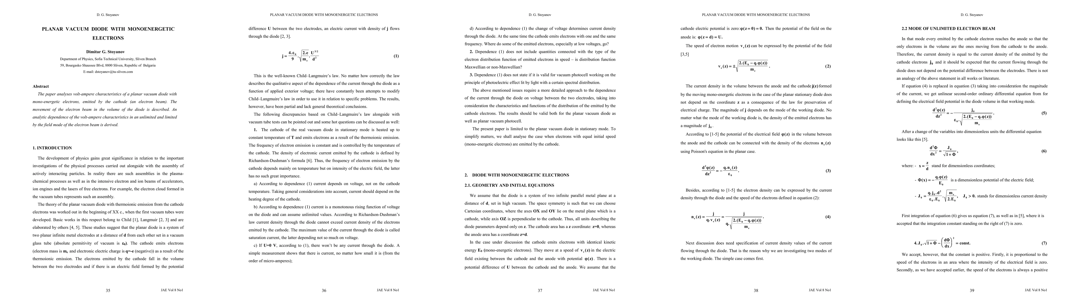 The paper analyses volt-ampere characteristics of a planar vacuum diode with mono-energetic electrons, emitted by the cathode (an electron beam). The movement of the electron beam in the volume of the diode is described. An analytic dependence of the volt-ampere characteristics in an unlimited and limited by the field mode of the electron beam is derived.