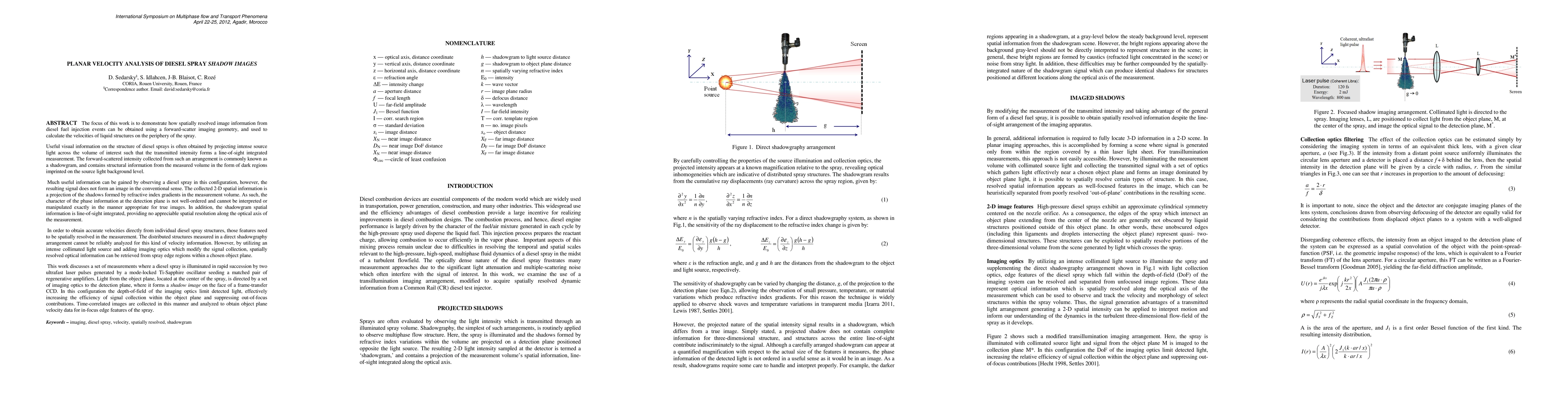 This research demonstrates a method for obtaining spatially resolved velocity data of diesel spray structures using forward-scatter imaging and ultrafast laser pulses. The technique enhances signal collection efficiency and suppresses out-of-focus contributions, enabling accurate velocity calculations of liquid structures at the spray's periphery.