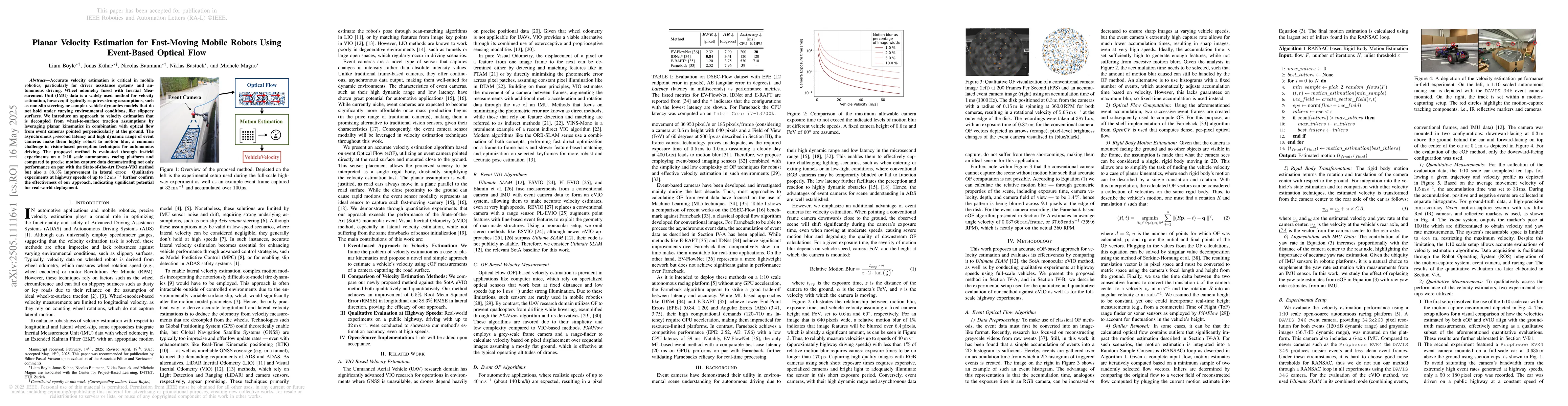 A new method for velocity estimation in fast-moving mobile robots uses event cameras to capture optical flow and planar kinematics, achieving performance on par with state-of-the-art methods while improving lateral error by 38.3%.