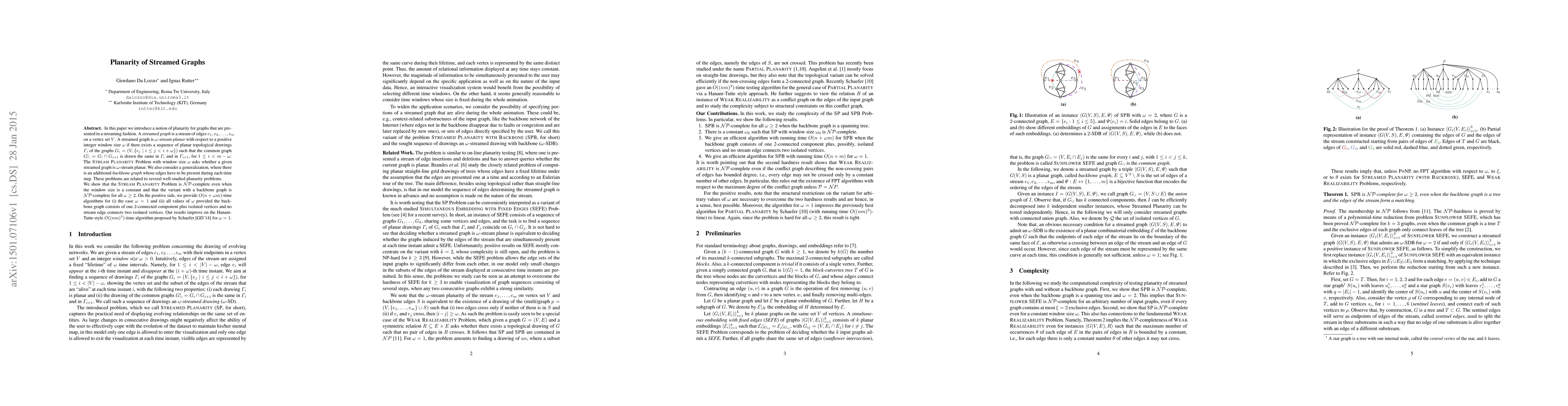 This paper introduces a concept of planarity for streamed graphs, where graphs are presented as a sequence of edges. It proves the Stream Planarity Problem is NP-complete even with a constant window size and provides efficient algorithms for specific cases, notably improving upon previous methods for $\omega = 1$.