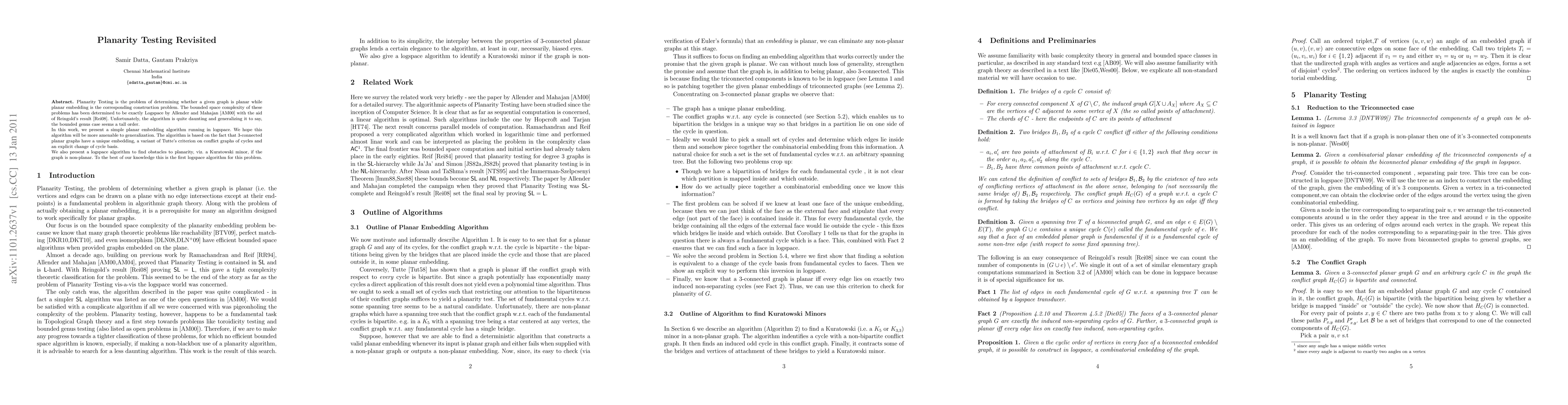 Planarity Testing is the problem of determining whether a given graph is planar while planar embedding is the corresponding construction problem. The bounded space complexity of these problems has been determined to be exactly Logspace by Allender and Mahajan with the aid of Reingold's result. Unfortunately, the algorithm is quite daunting and generalizing it to say, the bounded genus case seems a tall order. In this work, we present a simple planar embedding algorithm running in logspace. We hope this algorithm will be more amenable to generalization. The algorithm is based on the fact that 3-connected planar graphs have a unique embedding, a variant of Tutte's criterion on conflict graphs of cycles and an explicit change of cycle basis.% for planar graphs. We also present a logspace algorithm to find obstacles to planarity, viz. a Kuratowski minor, if the graph is non-planar. To the best of our knowledge this is the first logspace algorithm for this problem.