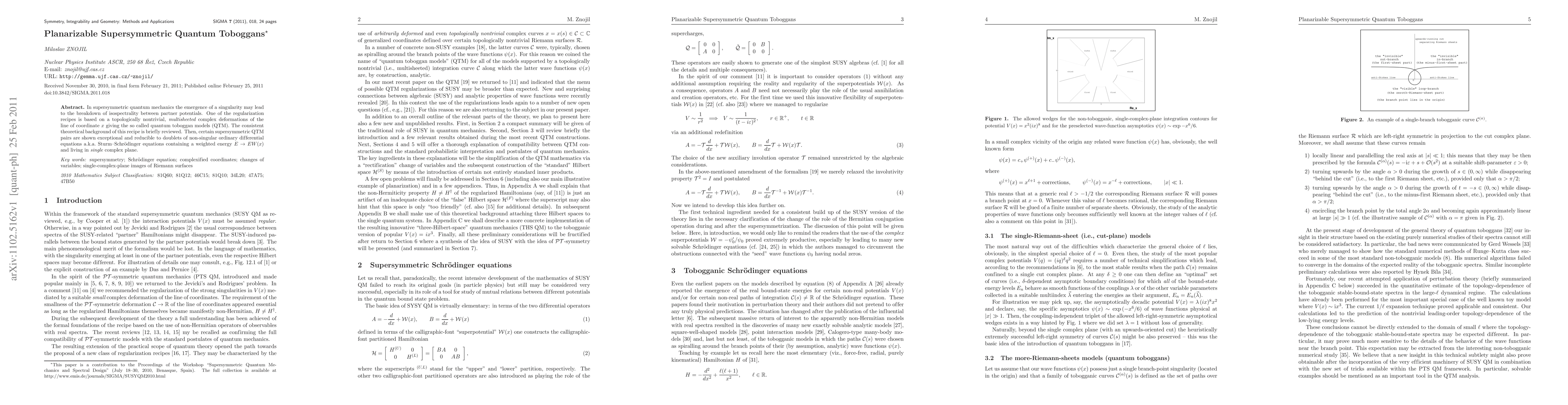 This paper reviews the regularization of singularities in supersymmetric quantum mechanics using quantum toboggan models (QTM), demonstrating that certain supersymmetric QTM pairs can be simplified to non-singular Sturm-Schrödinger equations in a single complex plane.