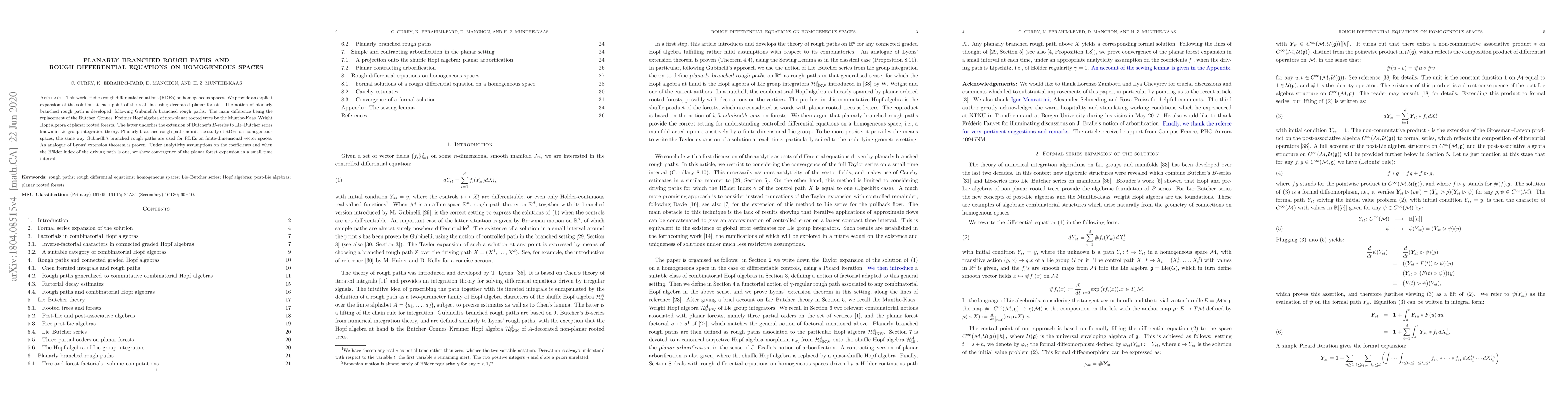 This paper develops planarly branched rough paths to study rough differential equations on homogeneous spaces, using the Munthe-Kaas-Wright Hopf algebra for planar forests. It extends T. Lyons' extension theorem and proves convergence of the planar forest expansion under analyticity and specific H\"older conditions.