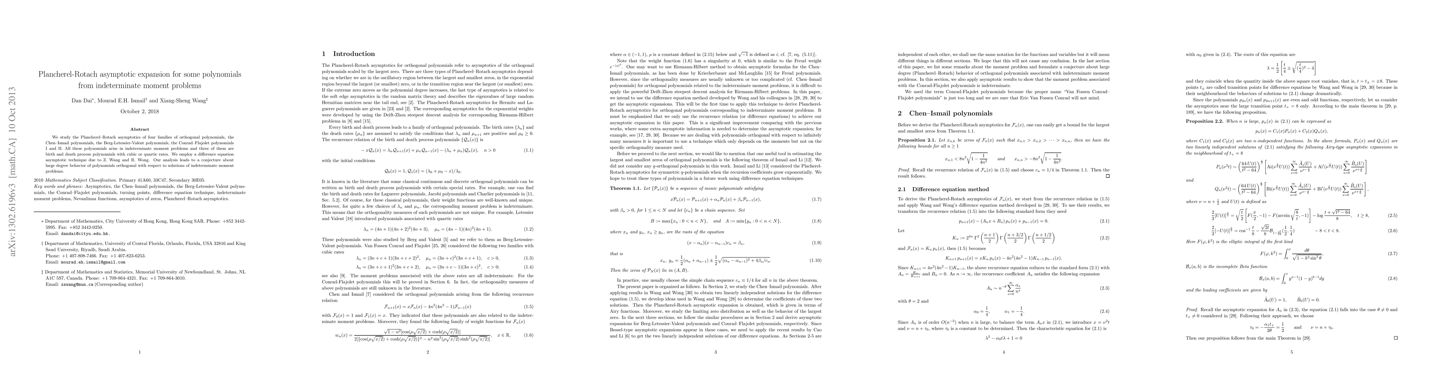 We study the Plancherel--Rotach asymptotics of four families of orthogonal polynomials, the Chen--Ismail polynomials, the Berg-Letessier-Valent polynomials, the Conrad--Flajolet polynomials I and II. All these polynomials arise in indeterminate moment problems and three of them are birth and death process polynomials with cubic or quartic rates. We employ a difference equation asymptotic technique due to Z. Wang and R. Wong. Our analysis leads to a conjecture about large degree behavior of polynomials orthogonal with respect to solutions of indeterminate moment problems.