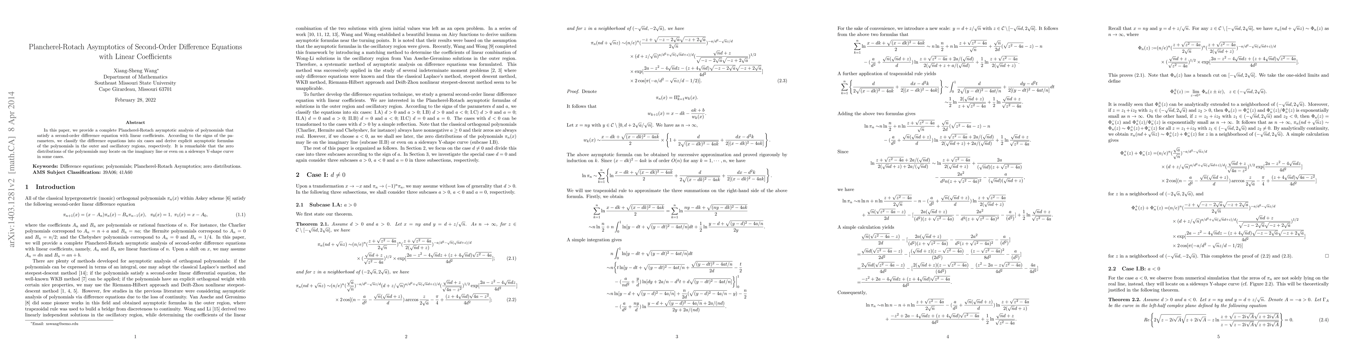 This paper provides asymptotic formulas for polynomials satisfying second-order difference equations with linear coefficients, classifying them into six cases based on parameter signs.