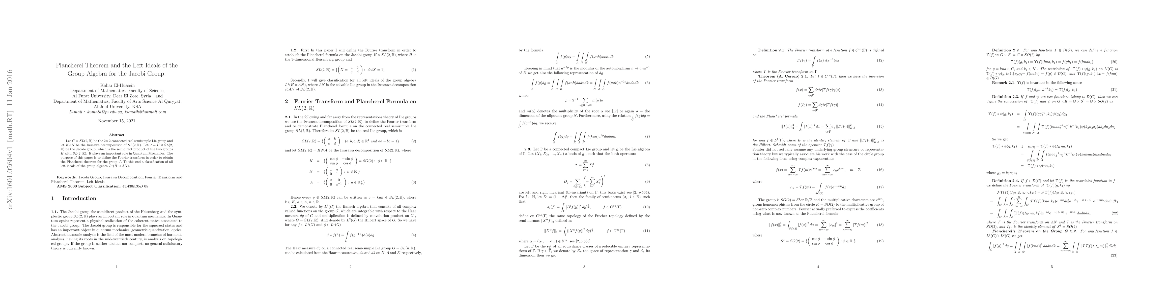 This paper explores the Plancherel theorem for the Jacobi group, a semidirect product of the Heisenberg group and a three-dimensional connected real Lie group, by classifying left ideals in its group algebra.