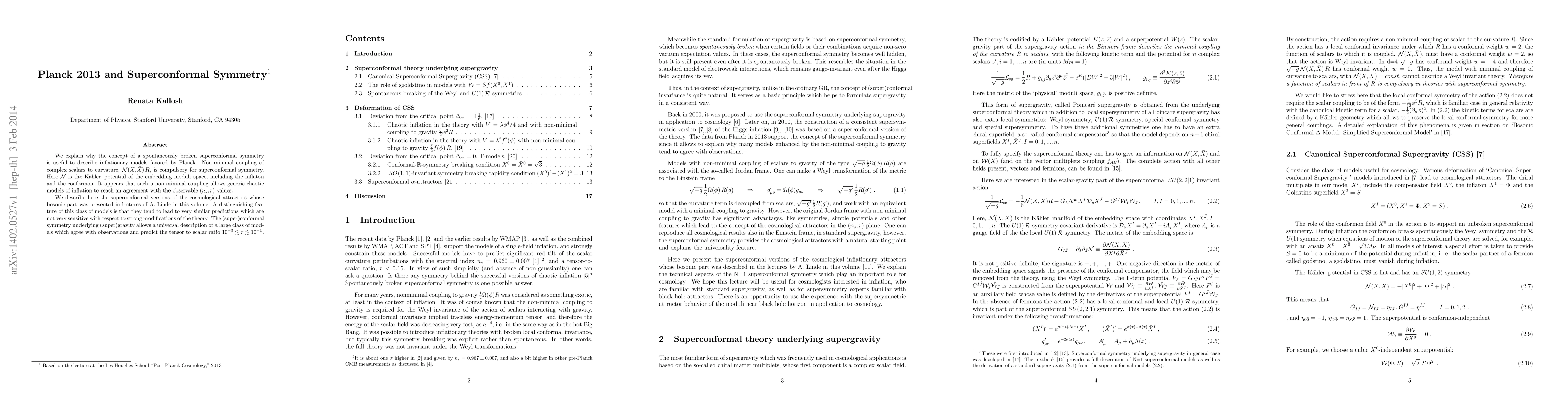This paper explores how spontaneously broken superconformal symmetry can describe inflationary models favored by Planck 2013 data, emphasizing the necessity of non-minimal coupling for complex scalars to curvature. It concludes that such models yield consistent predictions for observable values and are robust against theoretical modifications.