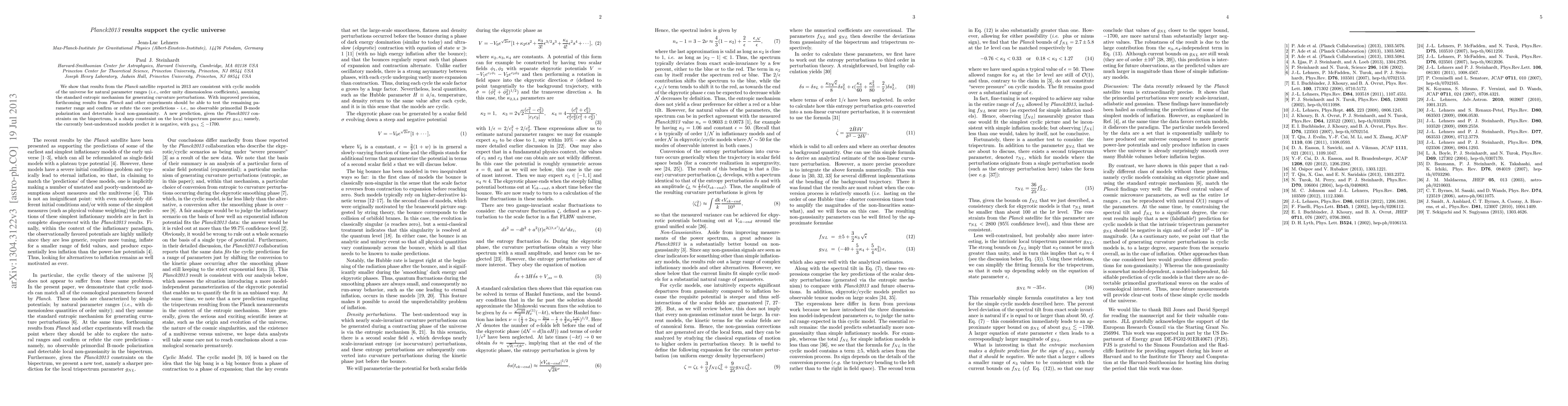 The 2013 Planck satellite results support cyclic universe models with natural parameter ranges, suggesting no observable primordial B-mode polarization and detectable local non-gaussianity. Upcoming data should refine these predictions, notably constraining the local trispectrum parameter g_{NL} to be negative, with g_{NL} < -1700.