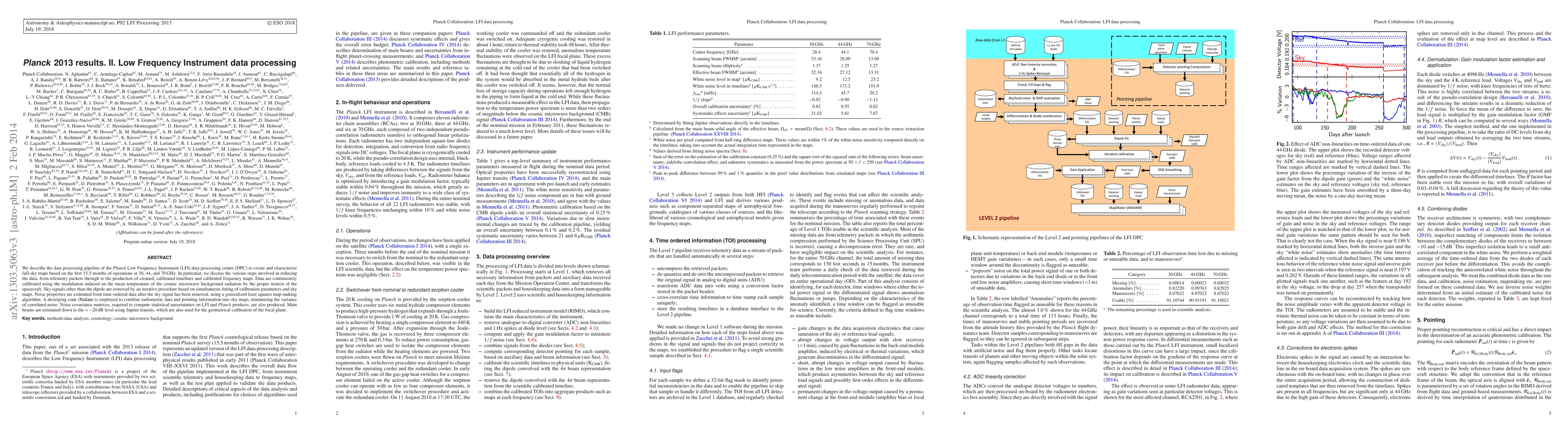 The Planck Low Frequency Instrument (LFI) data processing pipeline involves reducing raw telemetry to produce calibrated frequency maps, employing iterative procedures to remove sky signals, and using a destriping code to minimize noise variance, ultimately generating full-sky maps at 30, 44, and 70 GHz. Noise covariance matrices and main beam estimates are also derived for statistical analysis.