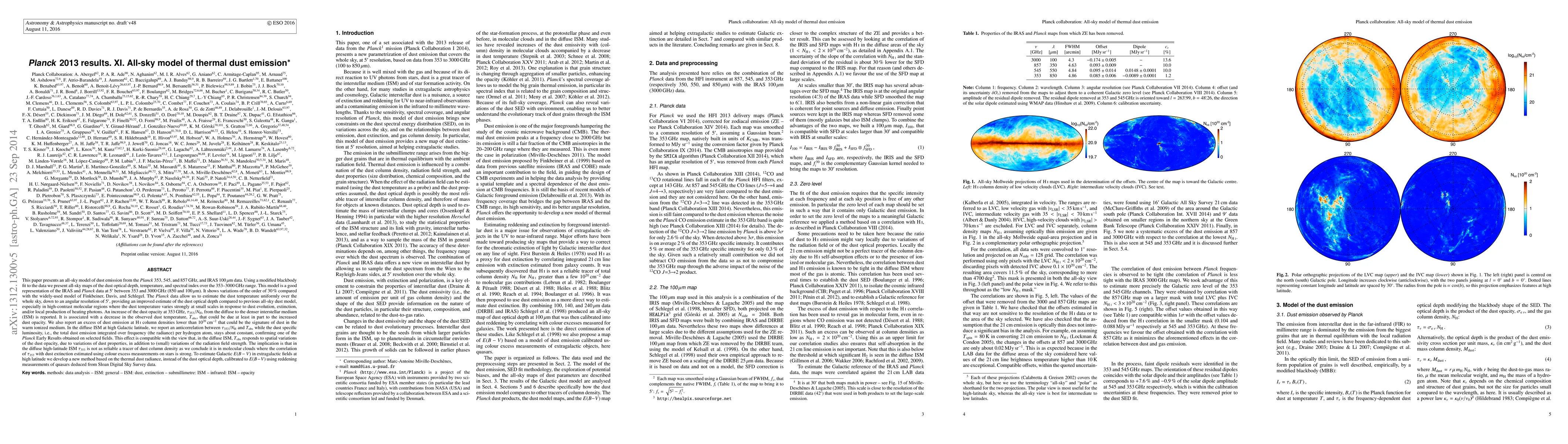The Planck 2013 research presents an all-sky dust emission model using 857, 545, 353 GHz, and IRAS 100 micron data, offering improved dust optical depth and temperature estimates. It reveals variations in dust properties, especially in denser ISM, and introduces a new method for estimating Galactic E(B-V) in high-latitude extragalactic fields using thermal dust radiance rather than optical depth.
