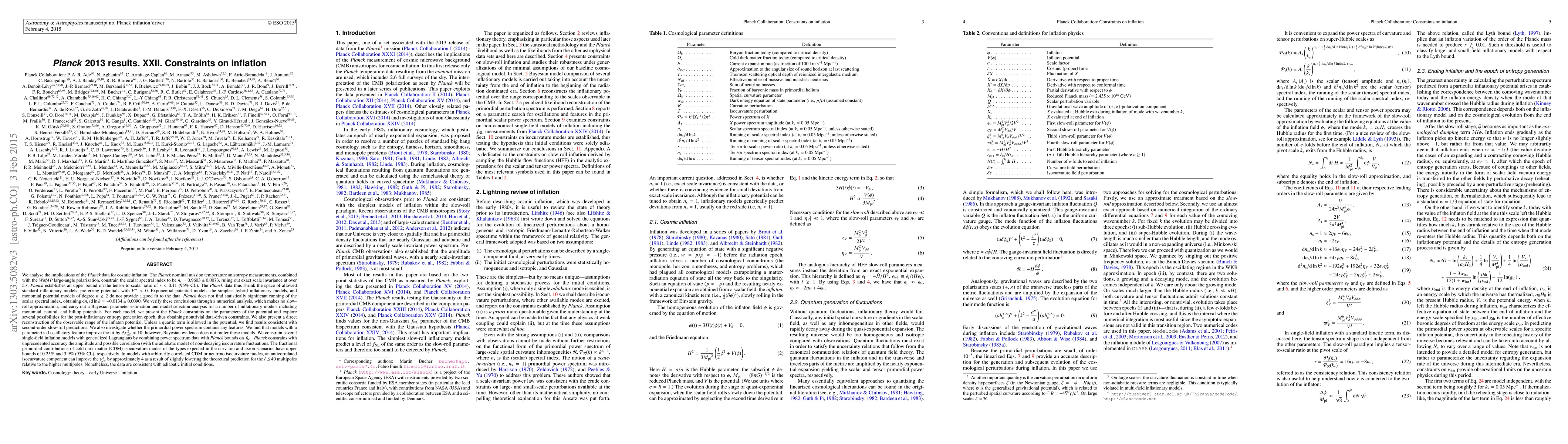We analyse the implications of the Planck data for cosmic inflation. The Planck nominal mission temperature anisotropy measurements, combined with the WMAP large-angle polarization, constrain the scalar spectral index to $n_s = 0.9603 \pm 0.0073$, ruling out exact scale invariance at over 5 $\sigma$. Planck establishes an upper bound on the tensor-to-scalar ratio of r < 0.11 (95% CL). The Planck data thus shrink the space of allowed standard inflationary models, preferring potentials with V" < 0. Exponential potential models, the simplest hybrid inflationary models, and monomial potential models of degree n > 2 do not provide a good fit to the data. Planck does not find statistically significant running of the scalar spectral index, obtaining $d n_s/d ln k = -0.0134 \pm 0.0090$. Several analyses dropping the slow-roll approximation are carried out, including detailed model comparison and inflationary potential reconstruction. We also investigate whether the primordial power spectrum contains any features. We find that models with a parameterized oscillatory feature improve the fit $\chi^2$ by ~ 10; however, Bayesian evidence does not prefer these models. We constrain several single-field inflation models with generalized Lagrangians by combining power spectrum data with bounds on $f_\mathrm{NL}$ measured by Planck. The fractional primordial contribution of CDM isocurvature modes in the curvaton and axion scenarios has upper bounds of 0.25% or 3.9% (95% CL), respectively. In models with arbitrarily correlated CDM or neutrino isocurvature modes, an anticorrelation can improve $\chi^2$ by approximatively 4 as a result of slightly lowering the theoretical prediction for the $\ell<40$ multipoles relative to the higher multipoles. Nonetheless, the data are consistent with adiabatic initial conditions.
