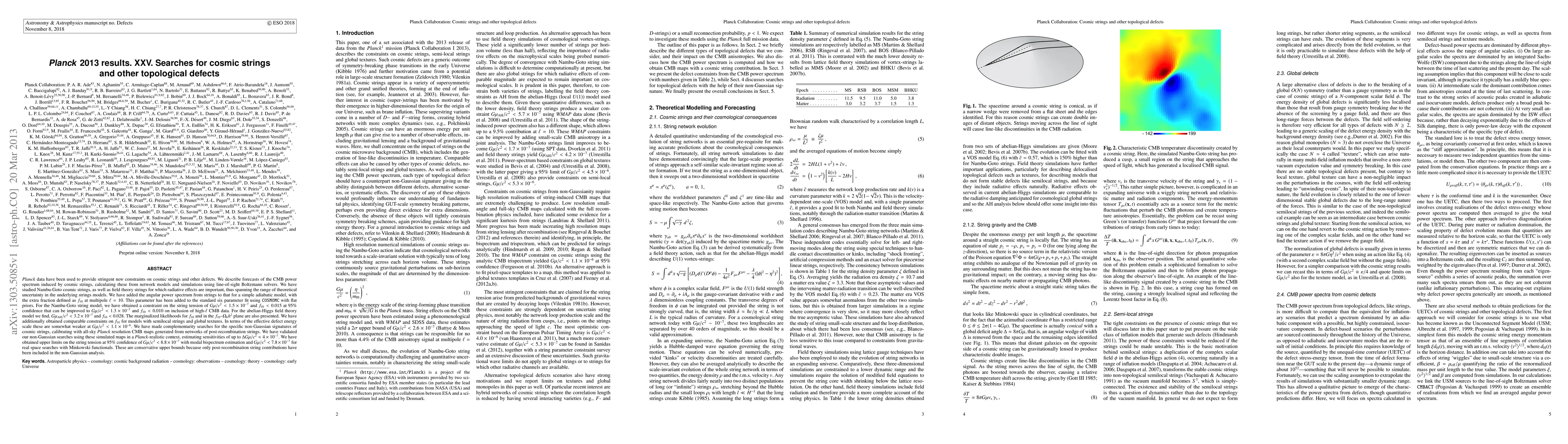Planck data have been used to provide stringent new constraints on cosmic strings and other defects. We describe forecasts of the CMB power spectrum induced by cosmic strings, calculating these from network models and simulations using line-of-sight Boltzmann solvers. We have studied Nambu-Goto cosmic strings, as well as field theory strings for which radiative effects are important, thus spanning the range of theoretical uncertainty in strings models. We have added the angular power spectrum from strings to that for a simple adiabatic model, with the extra fraction defined as $f_{10}$ at multipole $\ell=10$. This parameter has been added to the standard six parameter fit using COSMOMC with flat priors. For the Nambu-Goto string model, we have obtained a constraint on the string tension of $G\mu/c^2 < 1.5 x 10^{-7}$ and $f_{10} < 0.015$ at 95% confidence that can be improved to $G\mu/c^2 < 1.3 x 10^{-7}$ and $f_{10} < 0.010$ on inclusion of high-$\ell$ CMB data. For the abelian-Higgs field theory model we find, $G\mu_{AH}/c^2 < 3.2 x 10^{-7}$ and $f_{10} < 0.028$. The marginalized likelihoods for $f_{10}$ and in the $f_{10}$--$\Omega_b h^2$ plane are also presented. We have also obtained constraints on $f_{10}$ for models with semi-local strings and global textures for which $G\mu/c^2 < 1.1 x 10^{-6}$. We have made complementarity searches for the specific non-Gaussian signatures of cosmic strings, calibrating with all-sky Planck resolution CMB maps generated from networks of post-recombination strings. We have obtained upper limits on the string tension at 95% confidence of $G\mu/c^2 < 8.8 x 10^{-7}$ using modal bispectrum estimation and $G\mu/c^2 < 7.8 x 10^{-7}$ for real space searches with Minkowski functionals. These are conservative upper bounds because only post-recombination string contributions have been included in the non-Gaussian analysis.