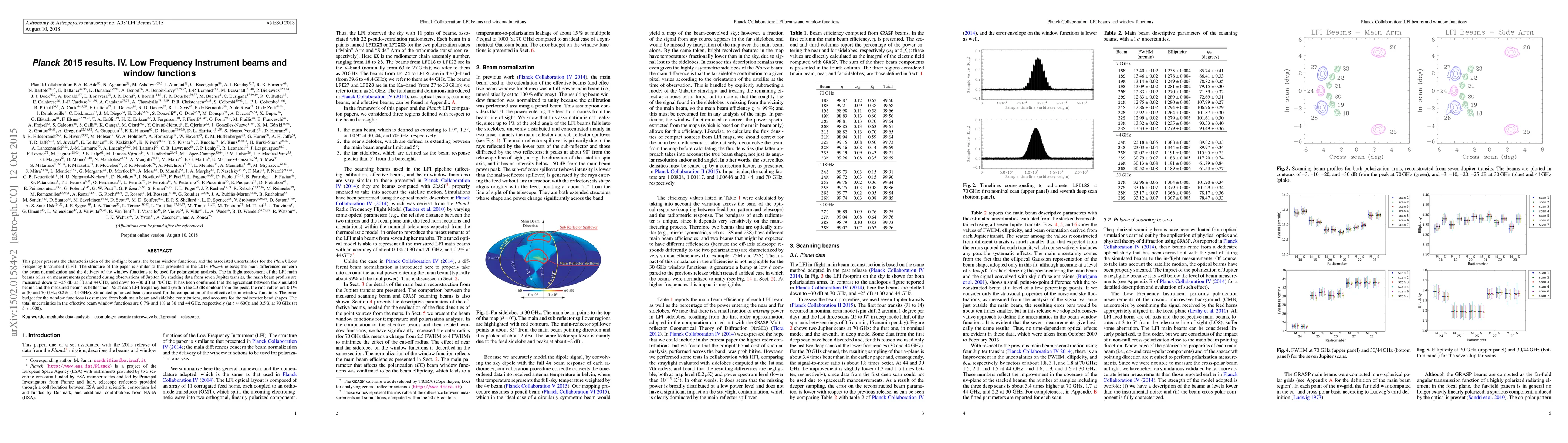 The Planck 2015 paper characterizes the Low Frequency Instrument (LFI) beams and window functions, achieving accurate measurements with uncertainties of less than 1% in some bands.
