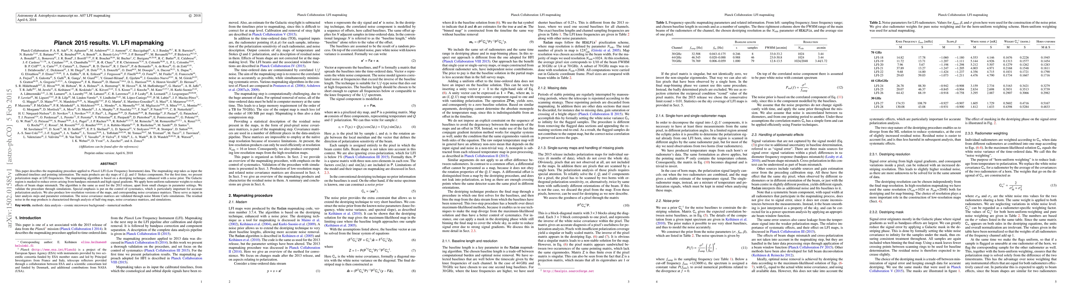 This paper outlines the mapmaking procedure for Planck LFI data, using a destriping technique with a noise prior. It presents the first polarization maps at LFI frequencies, validated through simulations with a focus on systematic control for precise polarization analysis. The methodology includes masking the Galactic region, applying horn-uniform weights, and producing low-resolution map versions for further analysis.