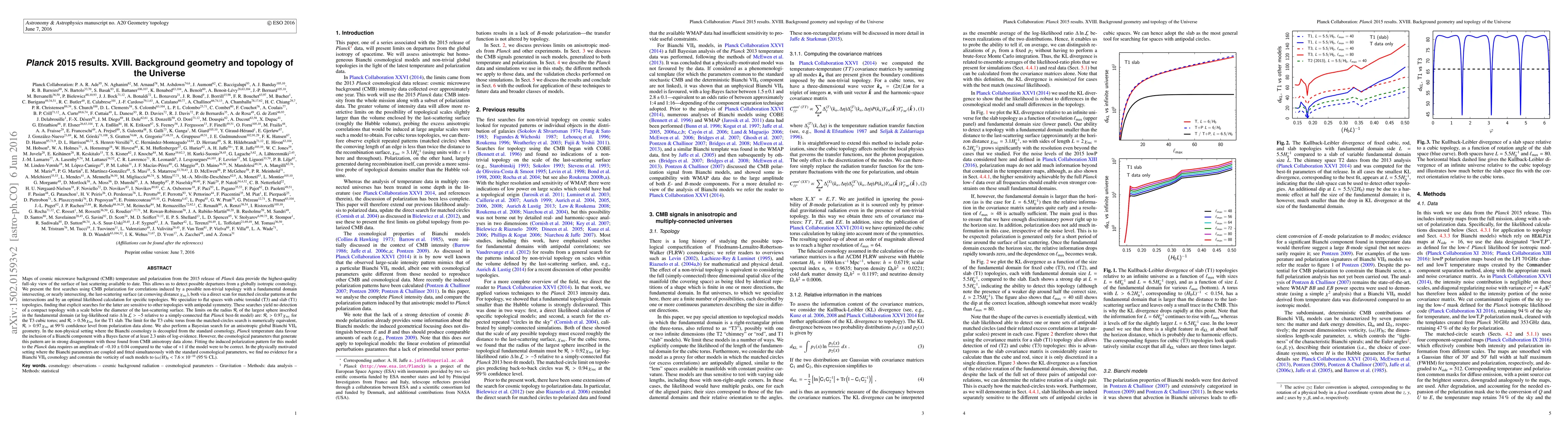 Full-sky CMB maps from the 2015 Planck release allow us to detect departures from global isotropy on the largest scales. We present the first searches using CMB polarization for correlations induced by a non-trivial topology with a fundamental domain intersecting, or nearly intersecting, the last scattering surface (at comoving distance $\chi_{rec}$). We specialize to flat spaces with toroidal and slab topologies, finding that explicit searches for the latter are sensitive to other topologies with antipodal symmetry. These searches yield no detection of a compact topology at a scale below the diameter of the last scattering surface. The limits on the radius $R_i$ of the largest sphere inscribed in the topological domain (at log-likelihood-ratio $\Delta\ln{L}>-5$ relative to a simply-connected flat Planck best-fit model) are $R_i>0.97\chi_{rec}$ for the cubic torus and $R_i>0.56\chi_{rec}$ for the slab. The limit for the cubic torus from the matched-circles search is numerically equivalent, $R_i>0.97\chi_{rec}$ (99% CL) from polarisation data alone. We also perform a Bayesian search for a Bianchi VII$_h$ geometry. In the non-physical setting where the Bianchi cosmology is decoupled from the standard cosmology, Planck temperature data favour the inclusion of a Bianchi component. However, the cosmological parameters generating this pattern are in strong disagreement with those found from CMB anisotropy data alone. Fitting the induced polarization pattern for this model to Planck data requires an amplitude of $-0.1\pm0.04$ compared to +1 if the model were to be correct. In the physical setting where the Bianchi parameters are fit simultaneously with the standard cosmological parameters, we find no evidence for a Bianchi VII$_h$ cosmology and constrain the vorticity of such models to $(\omega/H)_0<7.6\times10^{-10}$ (95% CL). [Abridged]