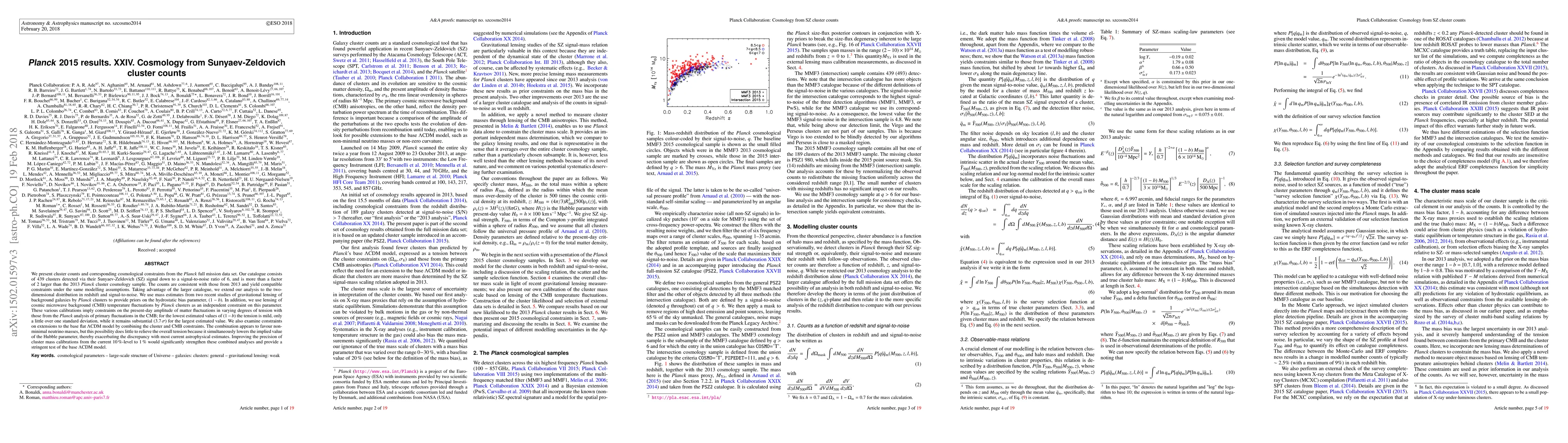 The Planck 2015 paper presents new cluster counts from Sunyaev-Zeldovich signal, yielding compatible cosmological constraints with earlier data, and reveals tension between predicted Hubble parameter values and current astrophysical estimates.