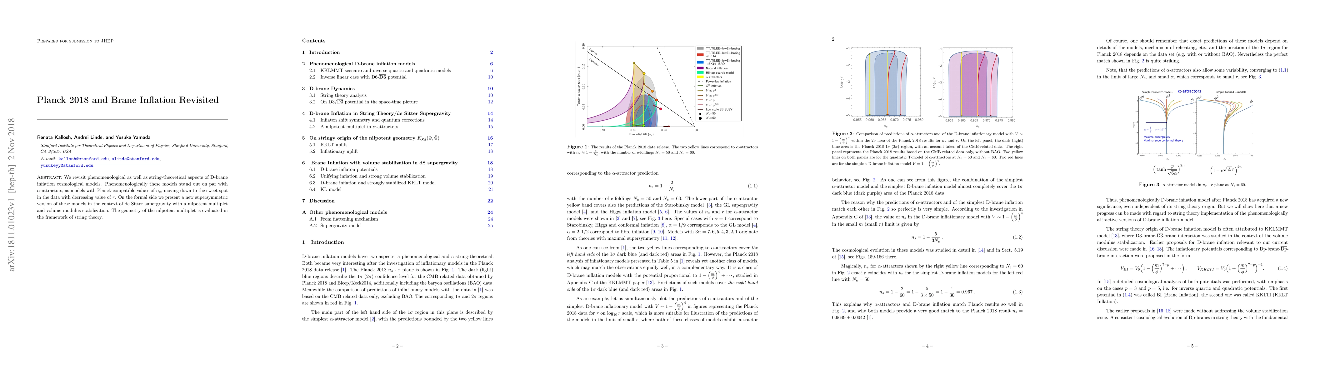 We revisit phenomenological as well as string-theoretical aspects of D-brane inflation cosmological models. Phenomenologically these models stand out on par with $\alpha$-attractors, as models with Planck-compatible values of $n_s$, moving down to the sweet spot in the data with decreasing value of $r$. On the formal side we present a new supersymmetric version of these models in the context of de Sitter supergravity with a nilpotent multiplet and volume modulus stabilization. The geometry of the nilpotent multiplet is evaluated in the framework of string theory.