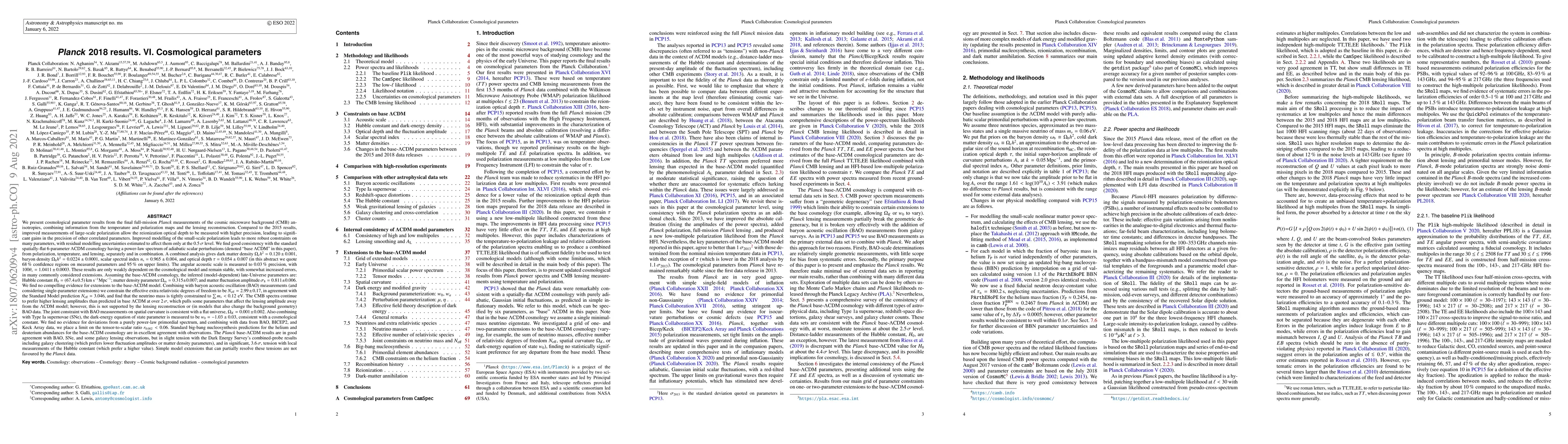 The Planck 2018 CMB measurements support the standard $Lambda$CDM cosmological model, finding $Omega_c h^2 = 0.120pm 0.001$, $n_s = 0.965pm 0.004$, and $ au = 0.054pm 0.007$. The results indicate a Hubble constant $H_0 = 67.4pm 0.5$ km/s/Mpc, matter density $Omega_m = 0.315pm 0.007$, and fluctuation amplitude $sigma_8 = 0.811pm 0.006$. There's a preference for higher lensing amplitudes, yet no strong evidence for model extensions beyond base $Lambda$CDM, with $N_{ m eff} = 2.99pm 0.17$ and upper limit on neutrino mass $sum m_ u< 0.12$ eV.